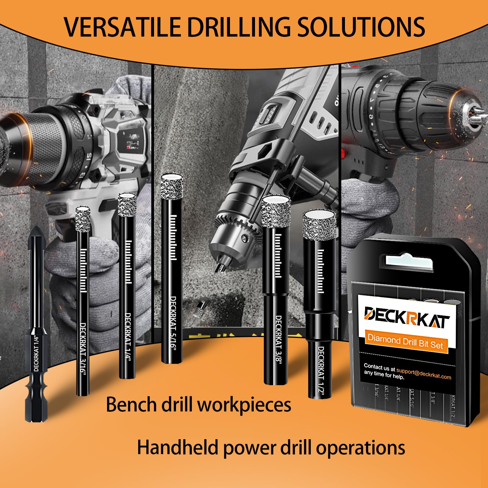 DECKRKAT 7-Piece Dry Diamond Drill Bits & Carbide Tile Drill Bit Set for Tile,Ceramic,Marble,Porcelain,Glass & Granite- 3/16", 1/4" (x2), 5/16", 3/8", 1/2" + 1/4" Masonry Bit
