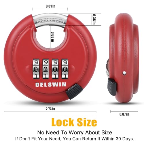 DELSWIN Outdoor Combination Padlock - 4 Digit Heavy Duty Disc Lock with Hardened Shackle,Combo Padlock for Gate,Storage Unit,Fence(25/64" Shackle, Red,2Pcs)