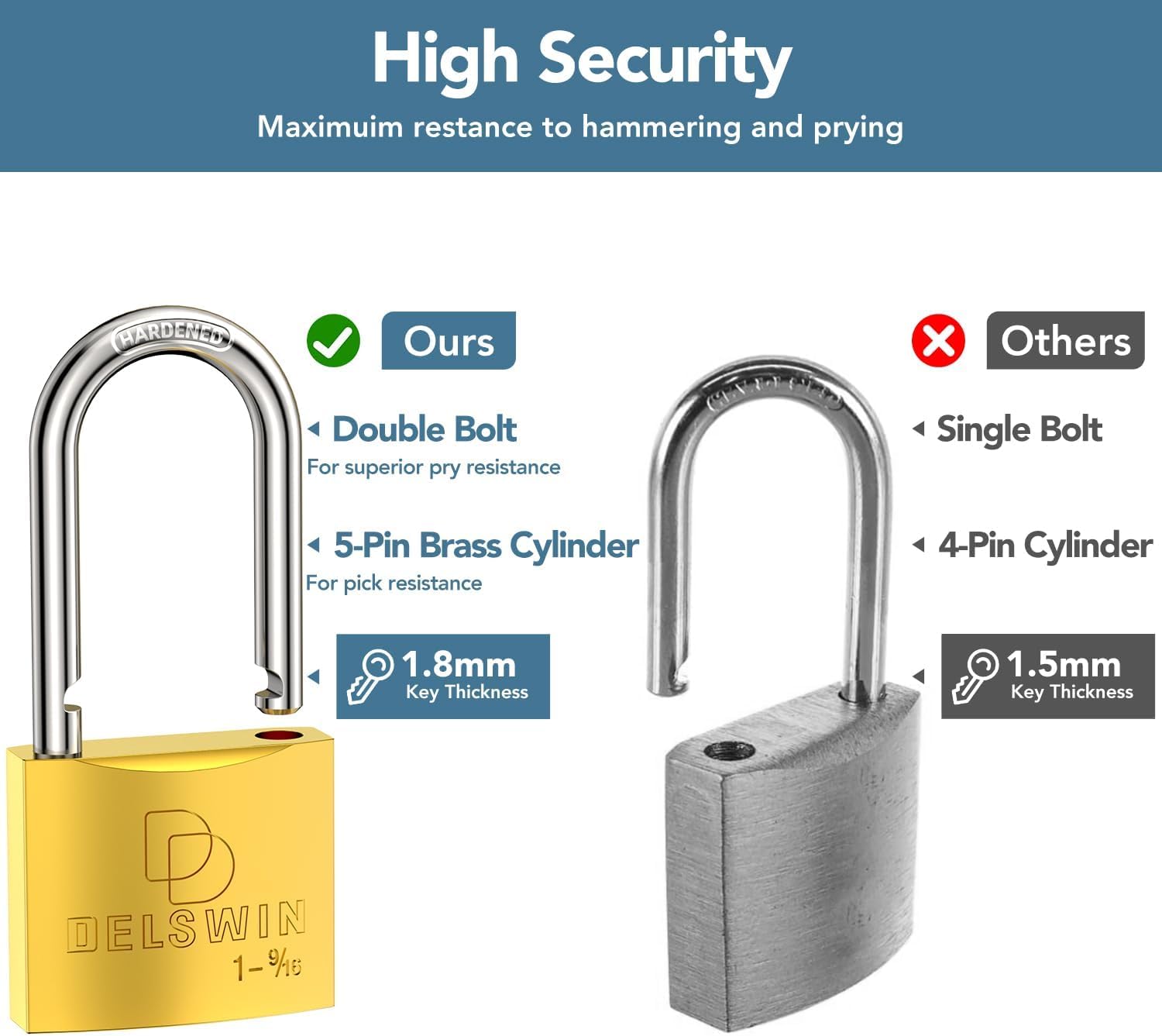 - Sturdy & Durability - DELSWIN keyed alike padlocks with solid brass lock body, hardened stainless steel shackle, and brass keys, which are anti-rust, and anti-corrosion. So they always function well outdoors. Even used for marine & offshore security.