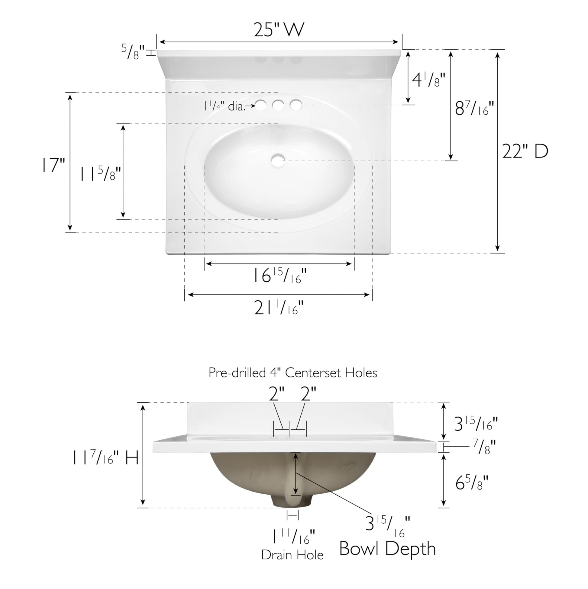 Details: This 25 in cultured marble vanity top features an integrated oval sink in a solid white finish, designed to fit standard 24 in vanity cabinets. Three pre-drilled faucet holes fit a 4 in centerset faucet or a single-mount with deck plate. The durable cultured marble surface is water-resistant, stain-resistant, and easy to clean with mild soap and a damp cloth. A 4 in integrated backsplash and overflow hole help prevent spills and wall damage, while the square flat edge profile adds a subtle modern touch. Backed by Design House’s 150 years of expertise and a 5-year limited warranty, it offers reliable style and function.