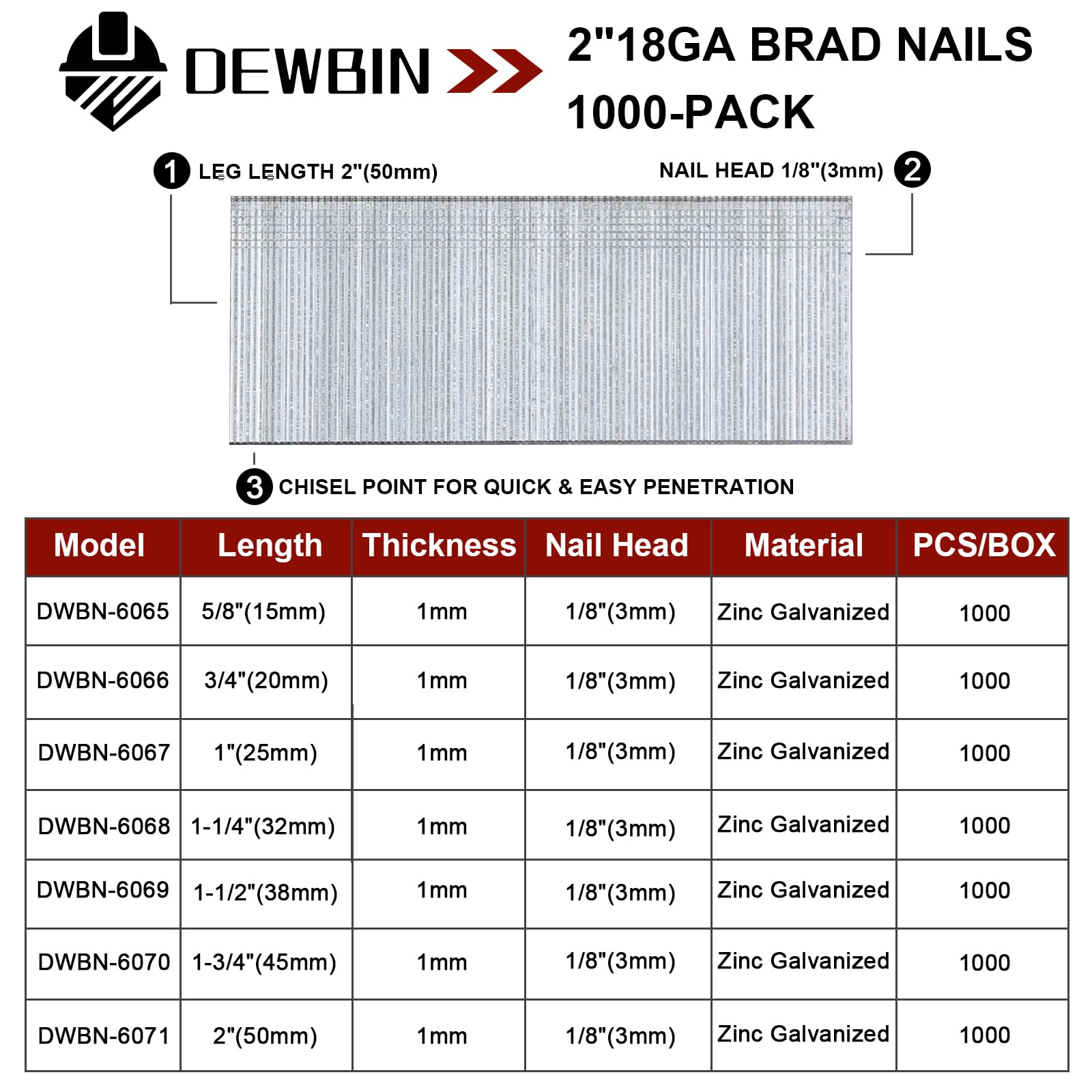 - PREMIUM PACKAGING: DEWBIN 1000 2-inch (50mm) 18 gauge brad nails features zinc-galvanized construction for enhanced durability resistance, packaged in a little cardboard box for efficient project completion.