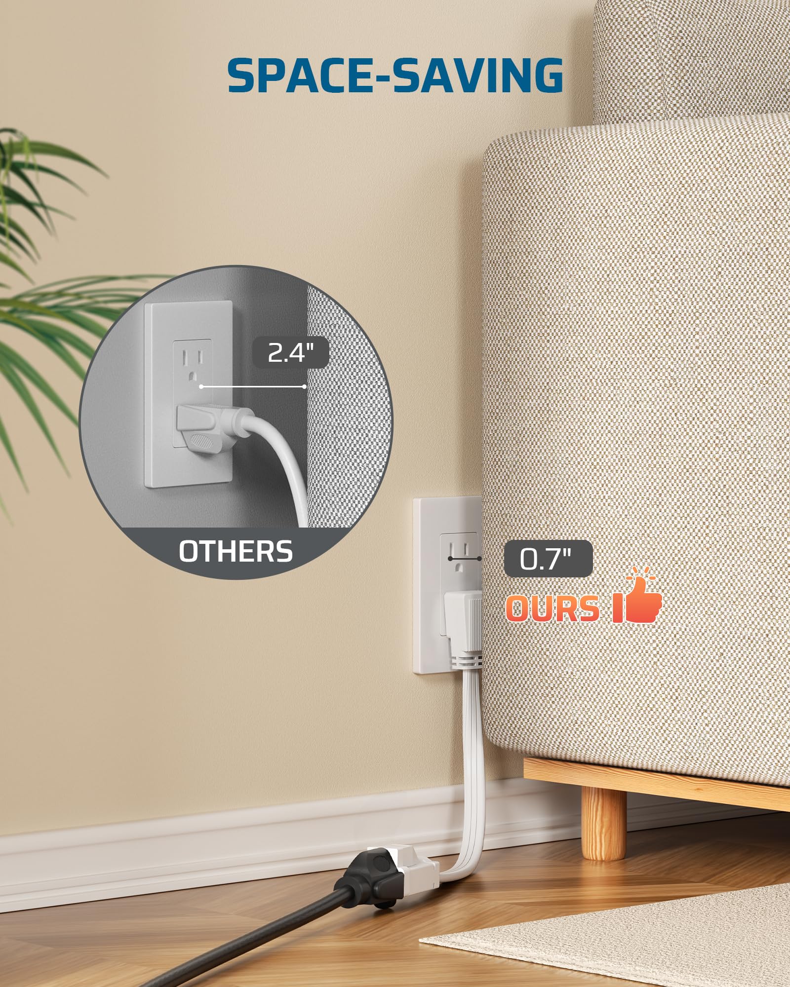 - [Space-Saving Flat Plug] Designed with a flat plug and slim cable, this 1 foot extension cord fits easily in tight spaces and lays flush behind desks, sofas, bookshelves, and kitchen appliances, keeping your area neat and organized