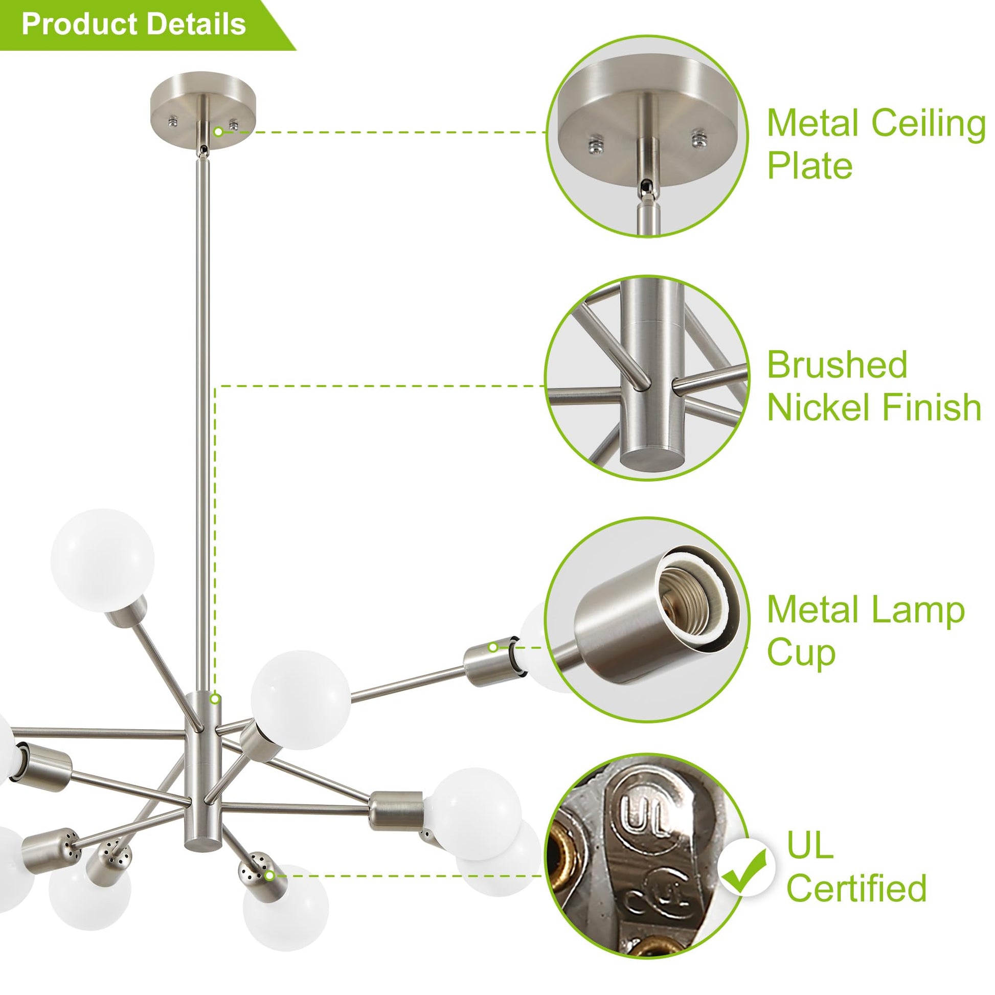 - Sturdy and Durable: The modern chandelier is made of sturdy metal, using classic electroplating technology, and a brushed nickel finish, It is very suitable for living rooms, offices, children's rooms, kitchens, farmhouses, etc
