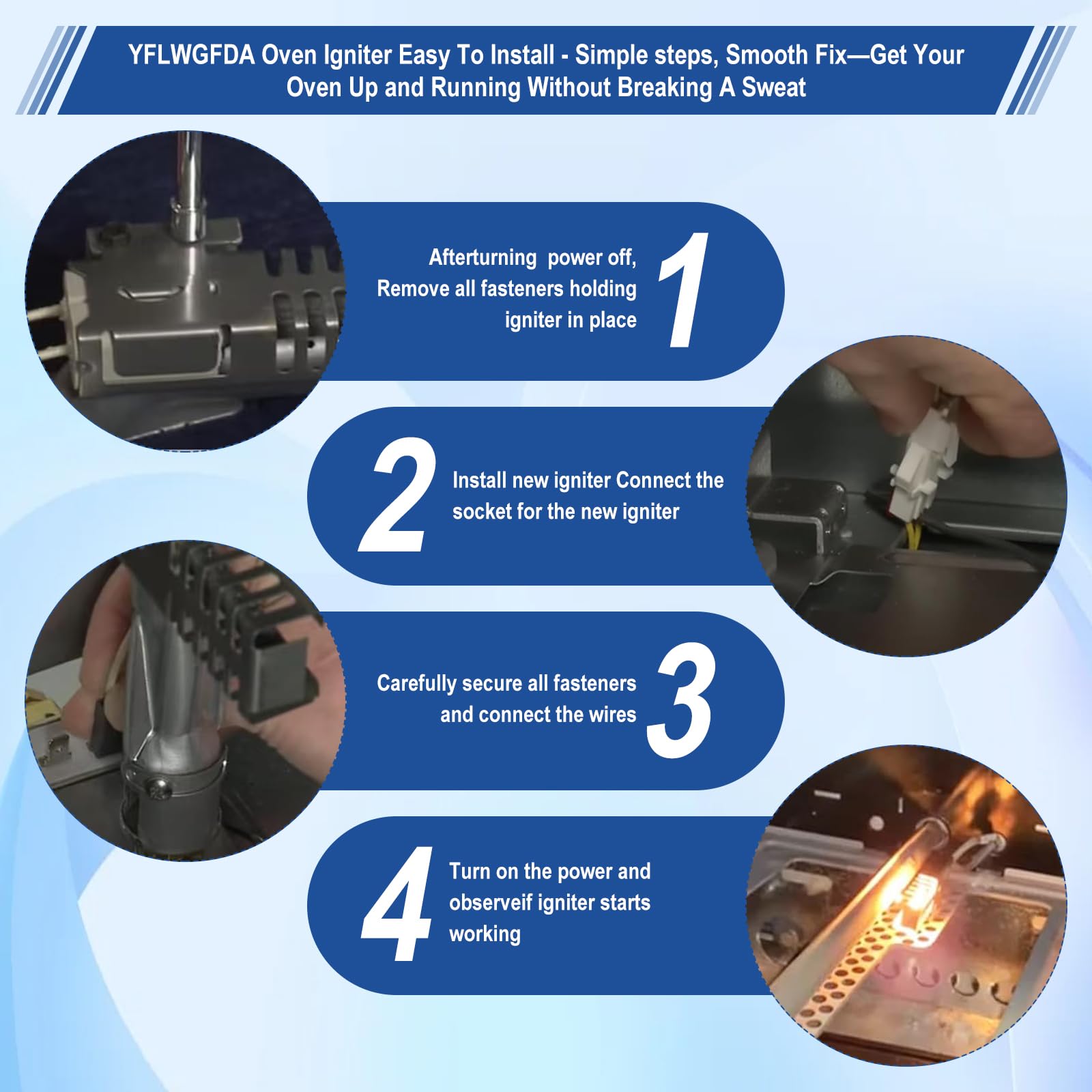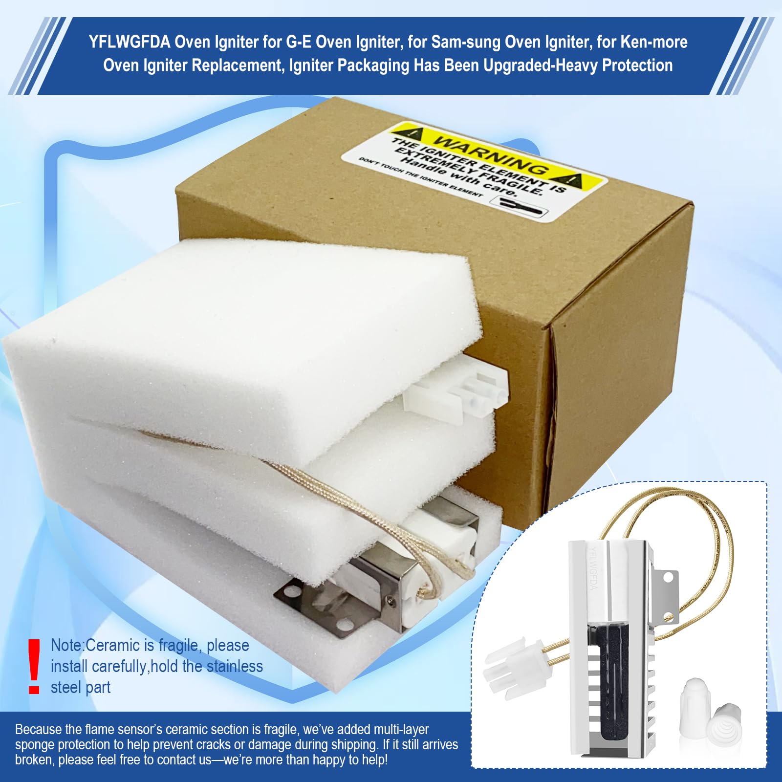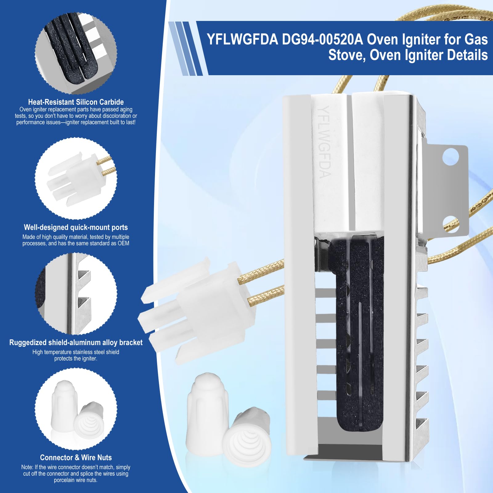 - Oven Igniter for Gas Stove Excellent Peprormance: The YFLWGFDA DG94-00520A for Sam-sung oven igniter is built from safe, high-quality materials and tested 20+ times for reliable performance. Perfect for fixing ovens that won’t heat, don’t reach temp, or only light with a top burner on. Designed to extend your range’s life and install easily. The igniter’s black silicon carbide is fragile—never touch it during install. Always disconnect power and gas before starting for a safe repair.