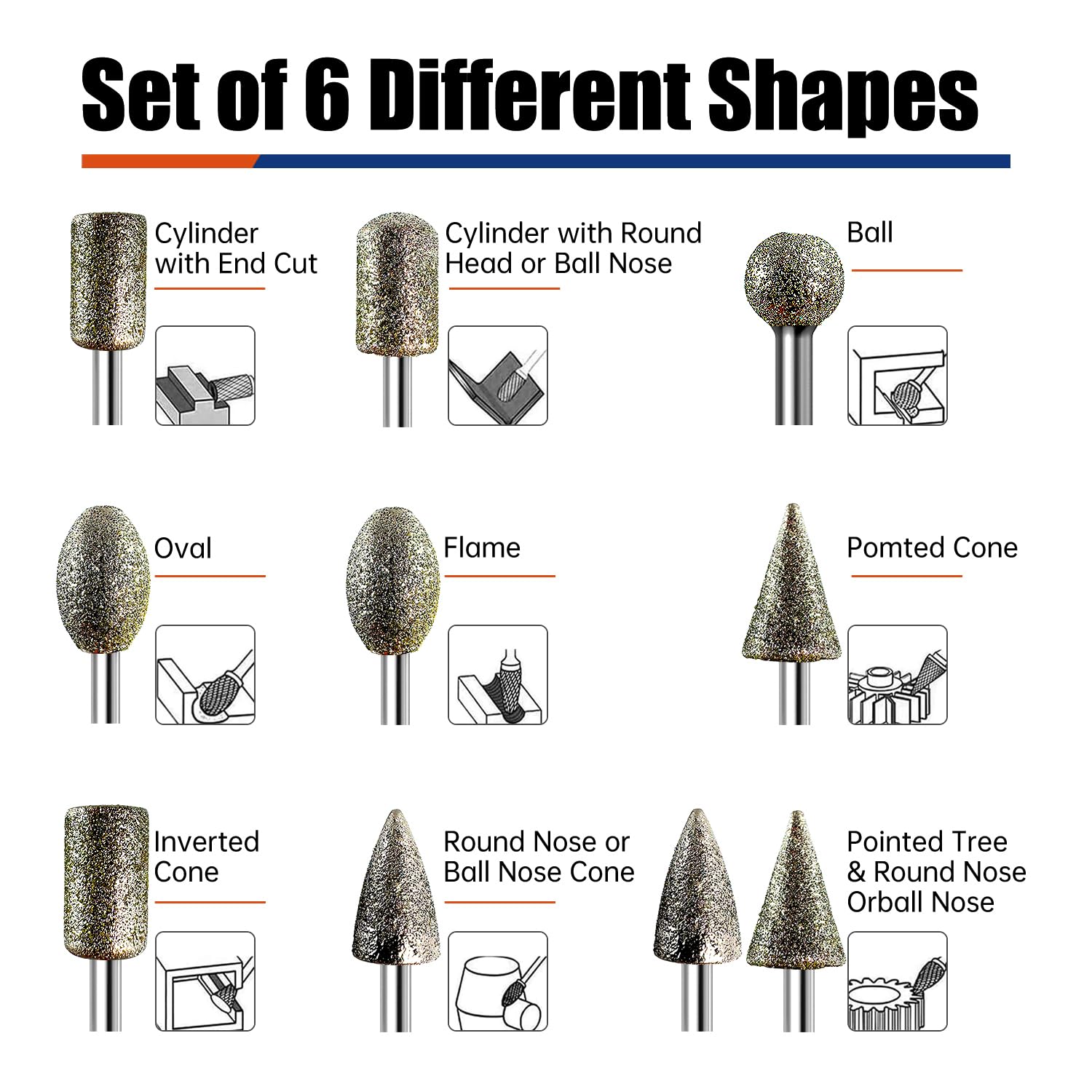 - WHAT CAN YOU GET: 20 Diamond Drill Bits. Diamond Grinding Bits are designed in various shapes. Different designs and rich shapes will meet your different needs in angles and depths, thereby improving work efficiency.