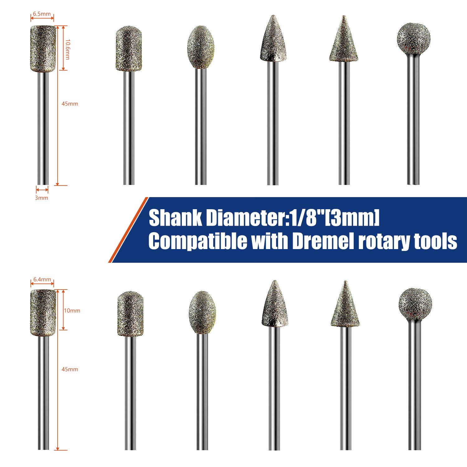 - APPLICABLE SIZE: Equipped with 1/8inchs (3 mm) universal shank that is compatible with Dremel and most rotary tools. Various shapes of bits meet different requirements, improve work efficiency, and save time and labor.