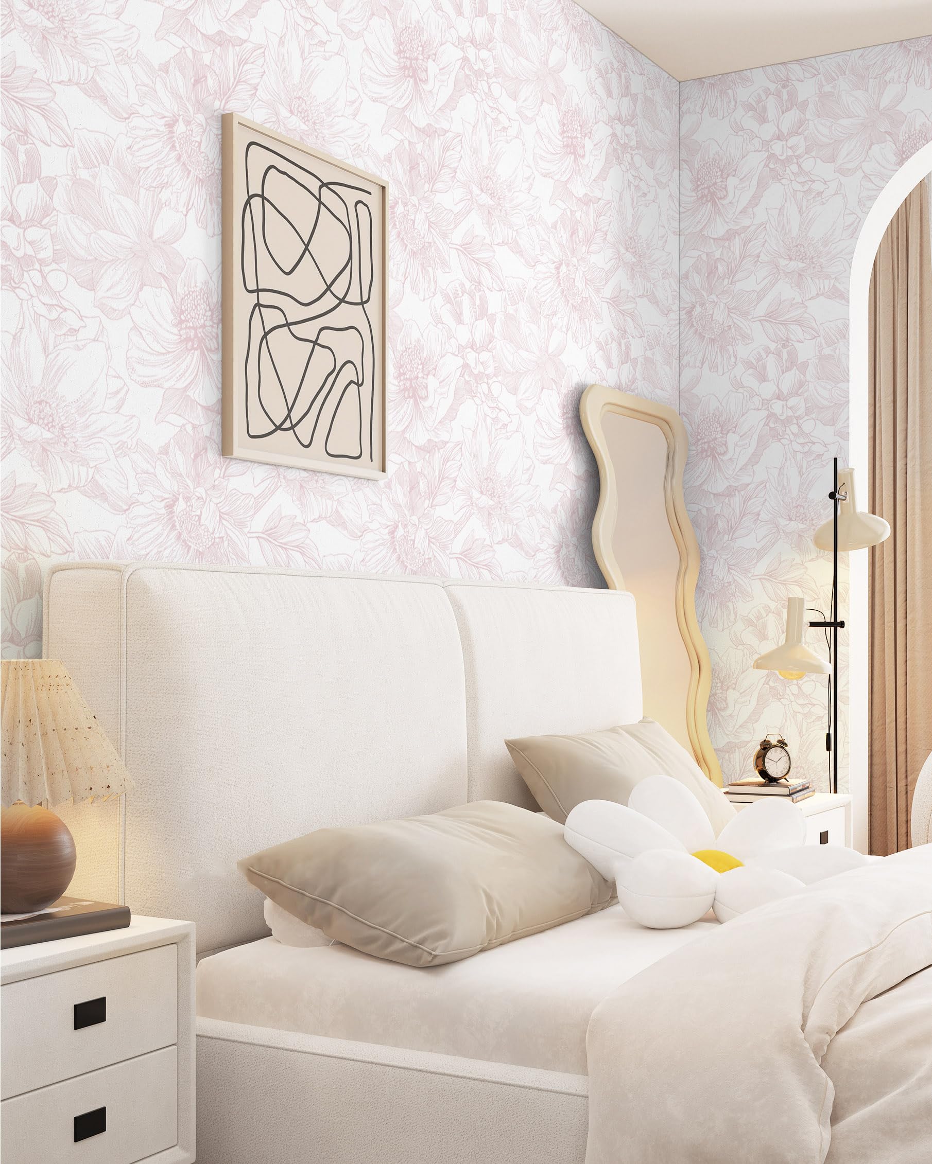 - 【NEW DESIGN CONCEPT】-Dimoon's new white-on-pink line floral wallpaper blends modern and bohemian styles by stitching together a variety of gorgeous, large florals, retaining the splendour of the flowers while enhancing the design and decorative function of the pattern with delicate lines and versatile styles.