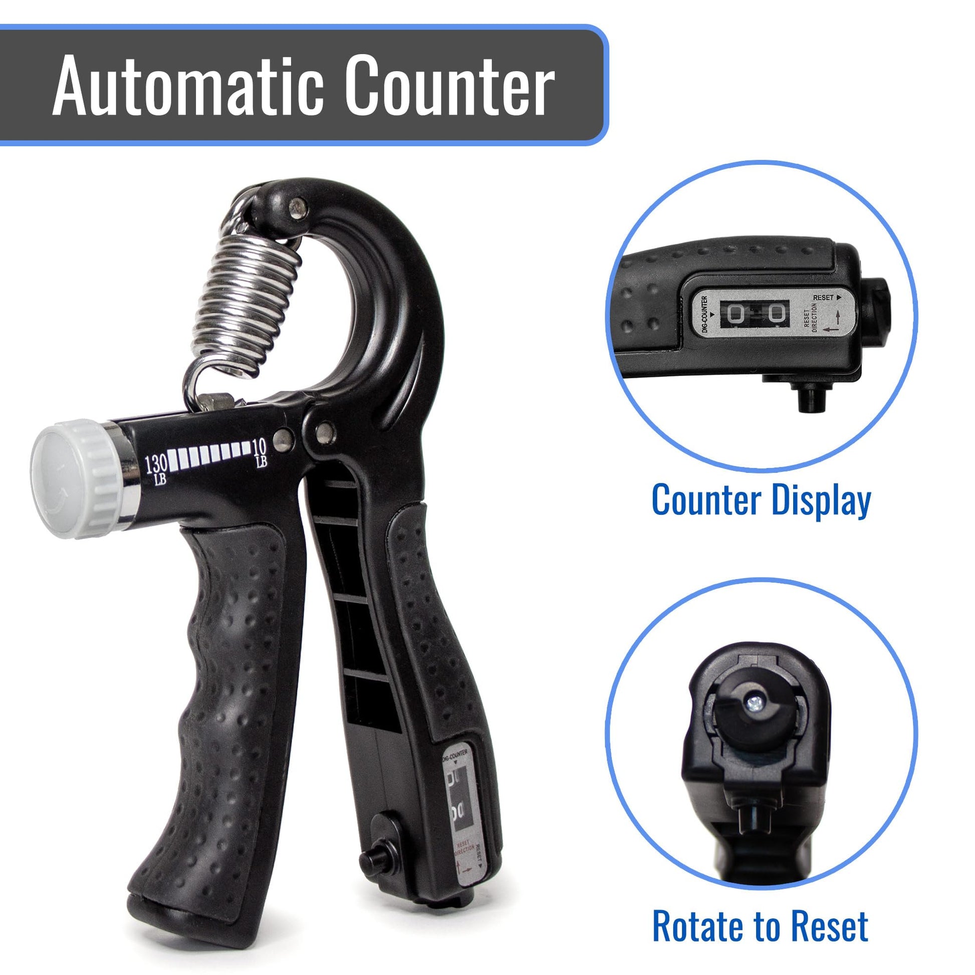 Details: DMI Compact Grip Strengtheners with adjustable resistance from 10-130lbs. The built-in grip tracker measures progress. FSA & HSA Eligible and comes in a set of 2 with a quick start guide.