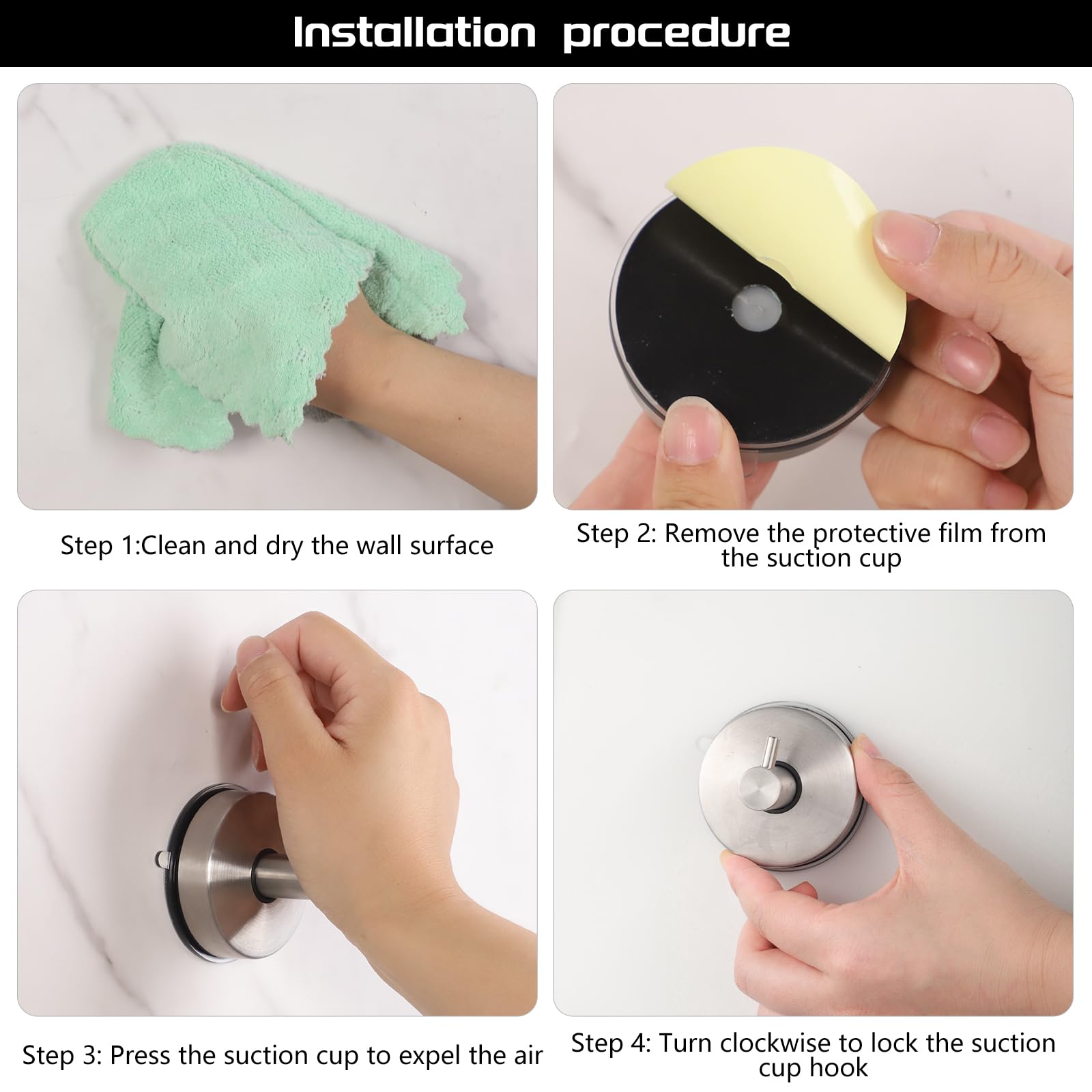 - 【Easy to Install】After cleaning and drying the area to be pasted, just tear off the suction cup protective film, press the suction cup hook against the wall, press hard for a few seconds to expel the air, and then turn the suction cup hook clockwise to lock. No drilling, no screws or other tools are required, the installation operation is very simple.