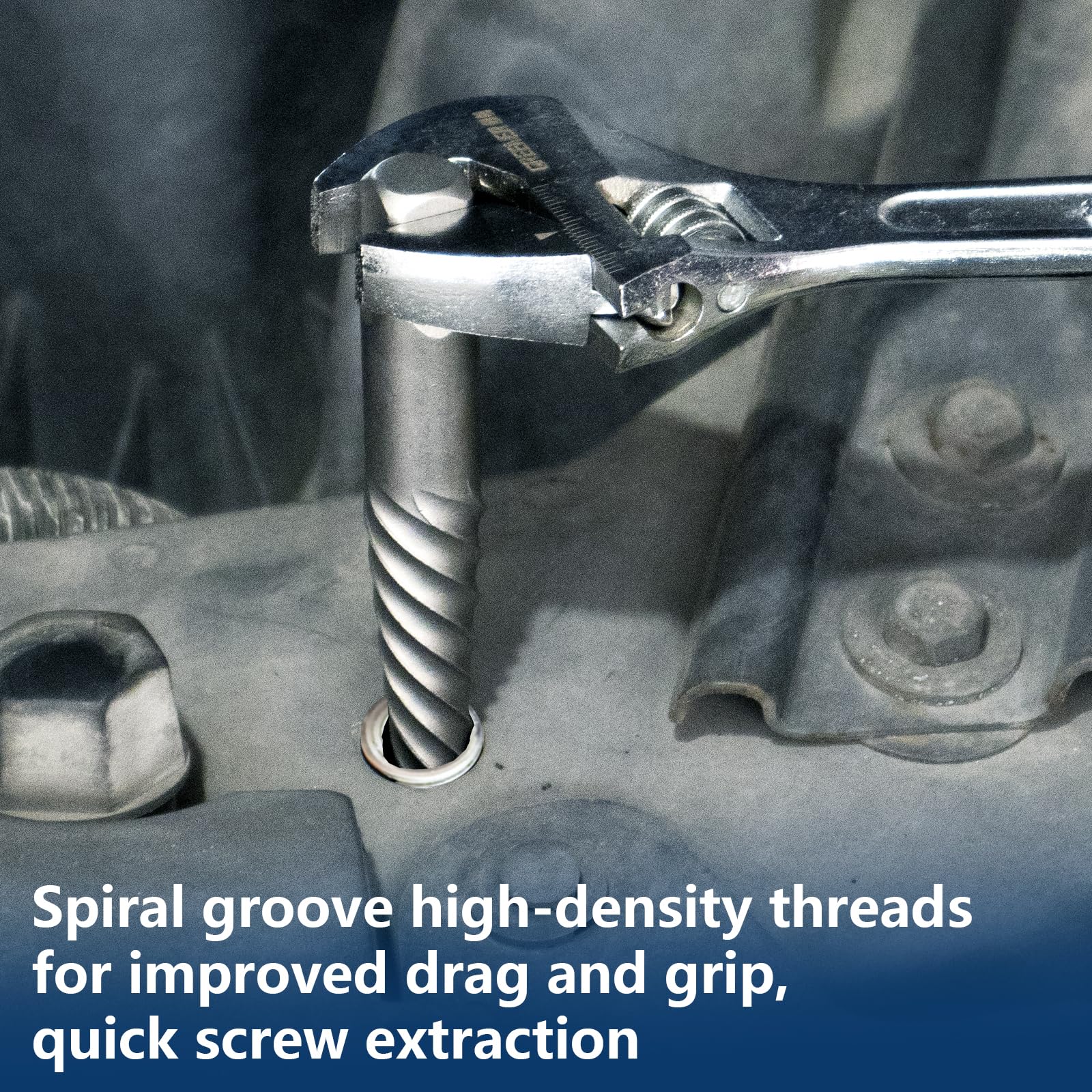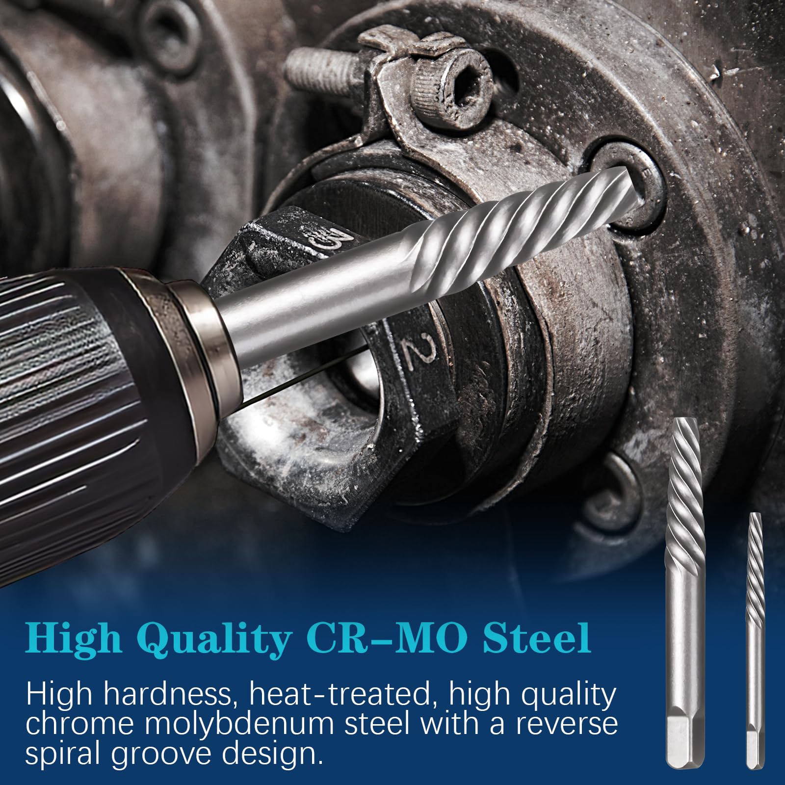 - High-Quality CR-MO Steel: The spiral screw extractor set is made of high hardness, heat-treated, high quality chrome molybdenum steel with a reverse spiral groove design that curves downward to provide maximum gripping force