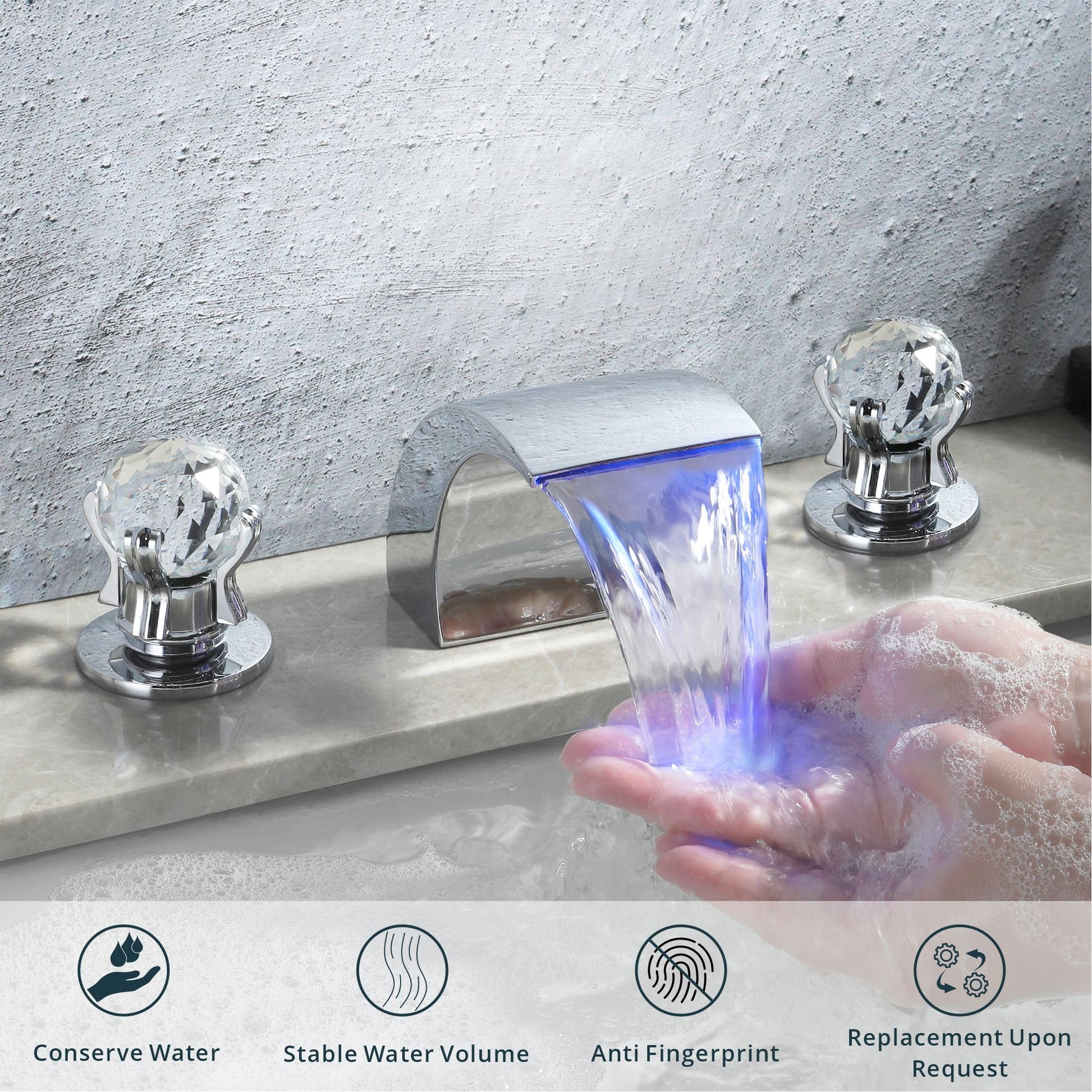 DOLGABA LED Bathroom Faucet 3 Hole Chrome Waterfall Bathroom Sink Faucet with Light, 8 Inch Widespread Modern Vanity Tap with 2 Crystal Handles and Water Supply Hoses