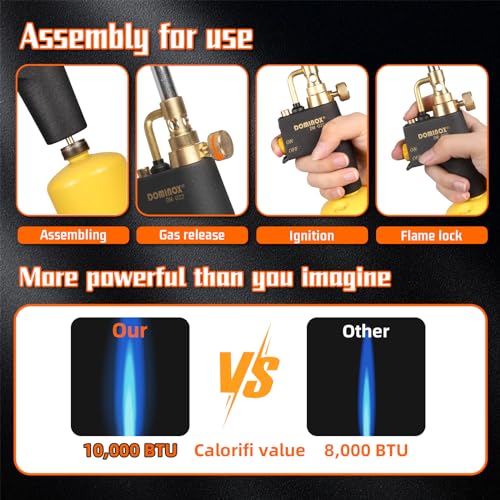 - ¡¼Multipurpose Mapp Gas Torch¡½DOMINOX mapp gas torch kit can one click start flame, extinguish and lock flame, improving gas combustion economy. Map gas torch kit is easy to operate and has a wide range of applications, including industrial welding, brazing, and soldering. Propane torch can also be applied in daily life, including ignition, welding, brazing, soldering, heat shrinkage, barbecue, snow melting, and rust removal.