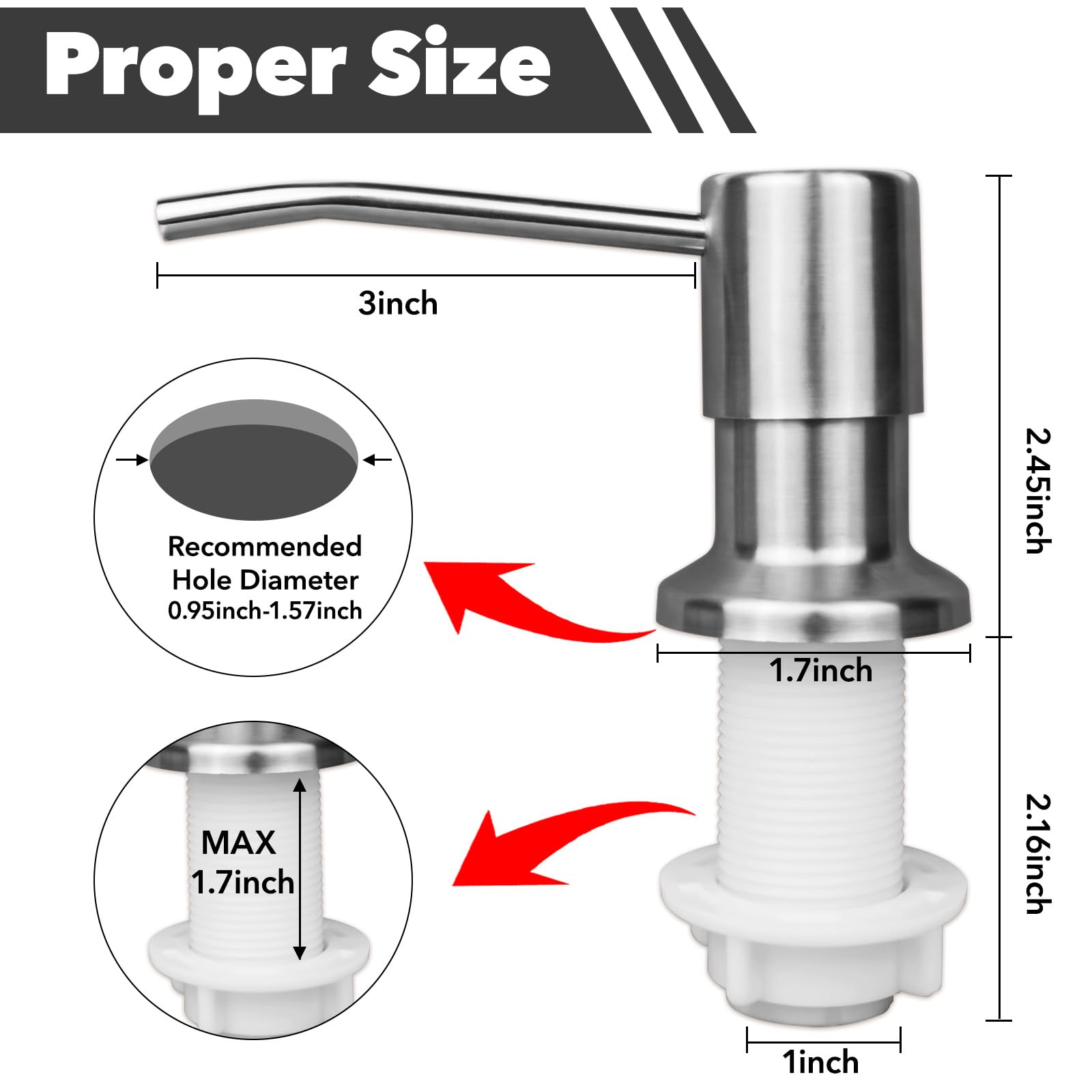 - Easy to Install: If you are still worried about installing a sink soap dispenser,our kitchen sink soap dispenser pump will provide you with a perfect solution.The hole size can be perfectly installed as long as it is between 0.94in and 1.57in,and is used by 99% of households.You only need to pull out the pump head,put the threaded rod into the hole, tighten the plastic locking nut,pass the pipe up through the threaded rod,and connect it to the pump head to complete the installation.You can install it on any type of kitchen sink or countertop in minutes