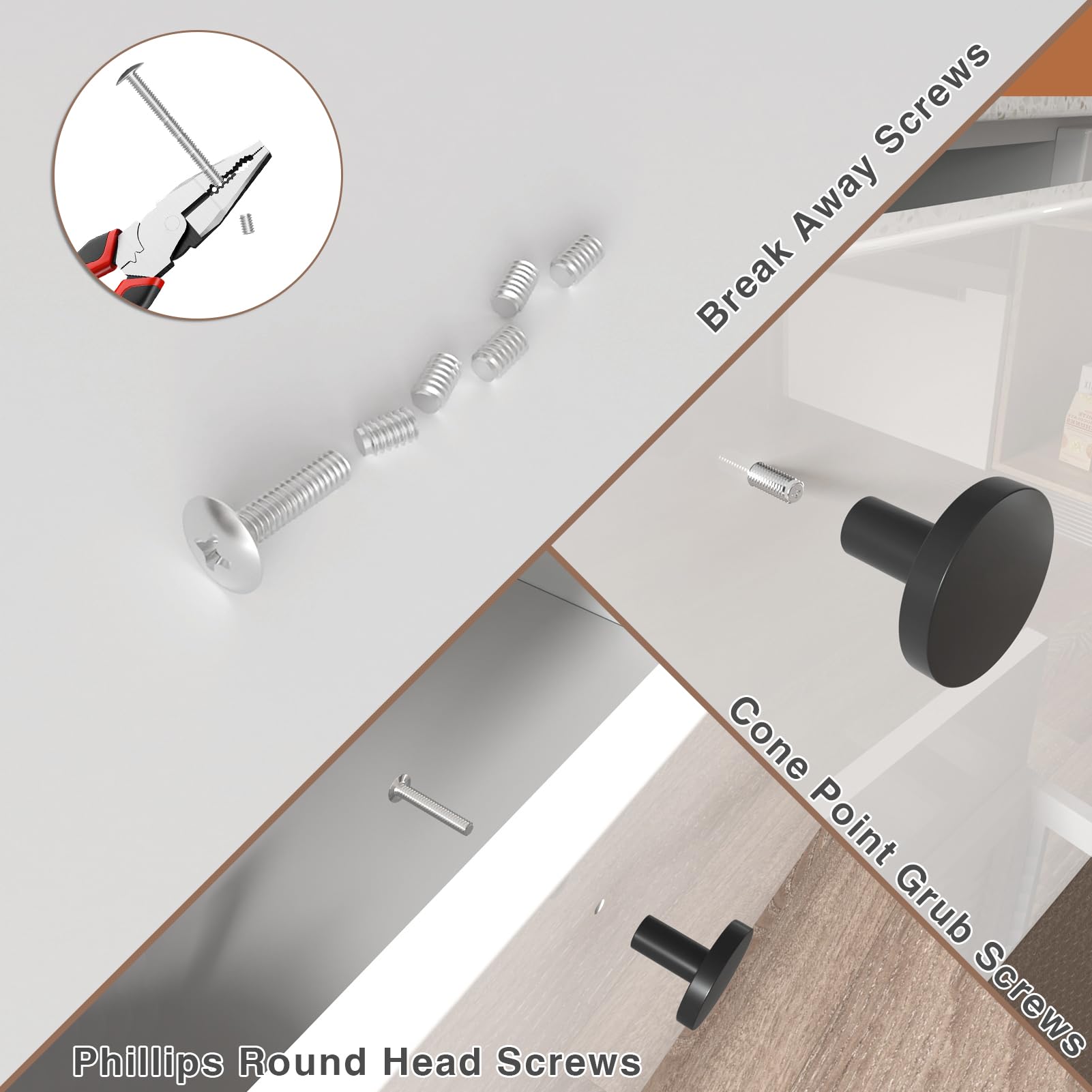 - Package Contents: 4 x Cabinet and Drawer Knobs, 4 x Break Away Screws(1.8''L), 4 x Cone Point Grub Screws(0.77''L), 4 x Phillips Round Head Screws(1''L), 1 x Installation Instructions. It will take just a few minutes to finish the installation! Each knobs are packing in plastic bag individually to prevent scratches.