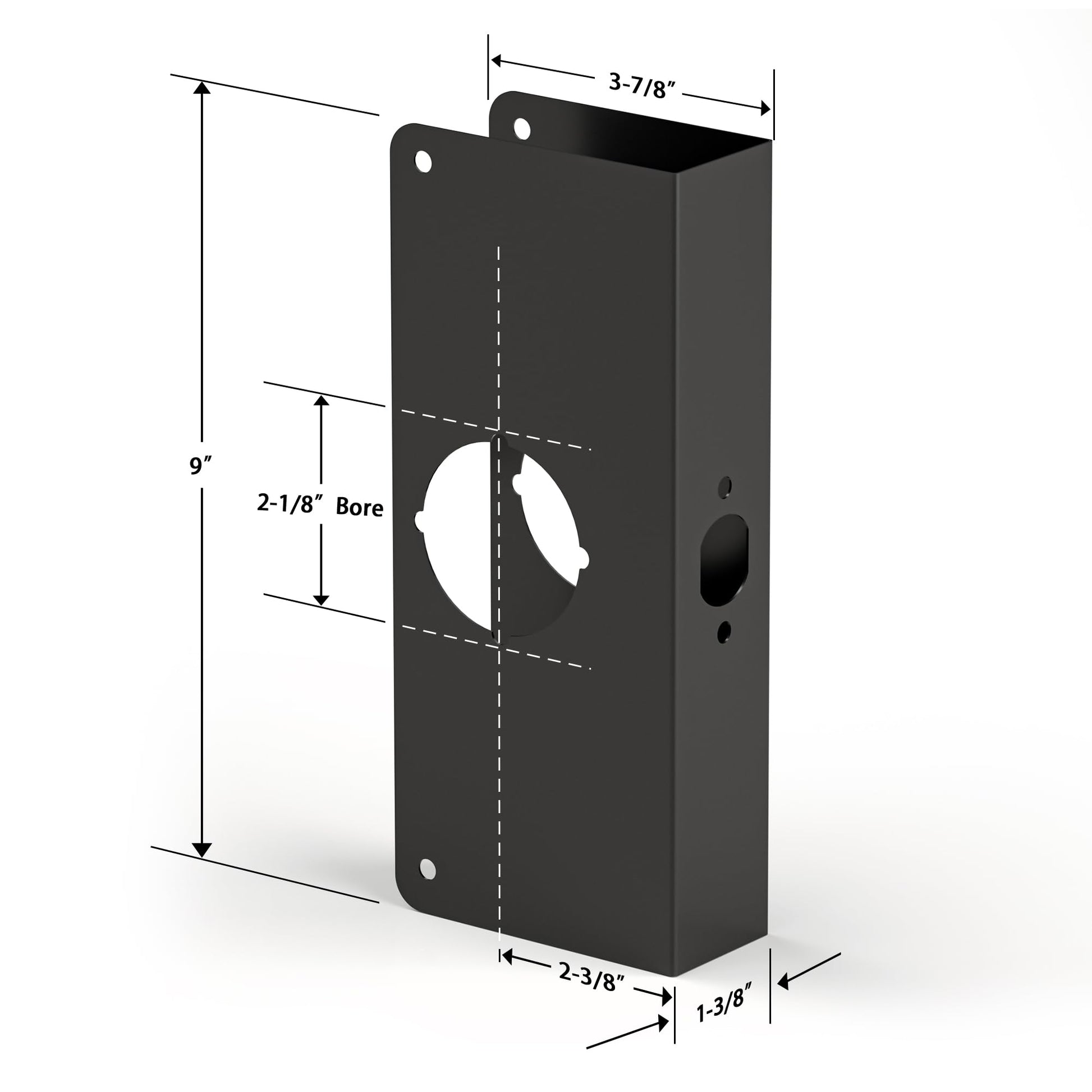 - Specifications: Black door reinforcement plates for home security fits 1-3/8" thick doors, 2-1/8" bores, for 2-3/8" backset; The size of the plate is 3-7/8" width x 9" height x 1-3/8" thick