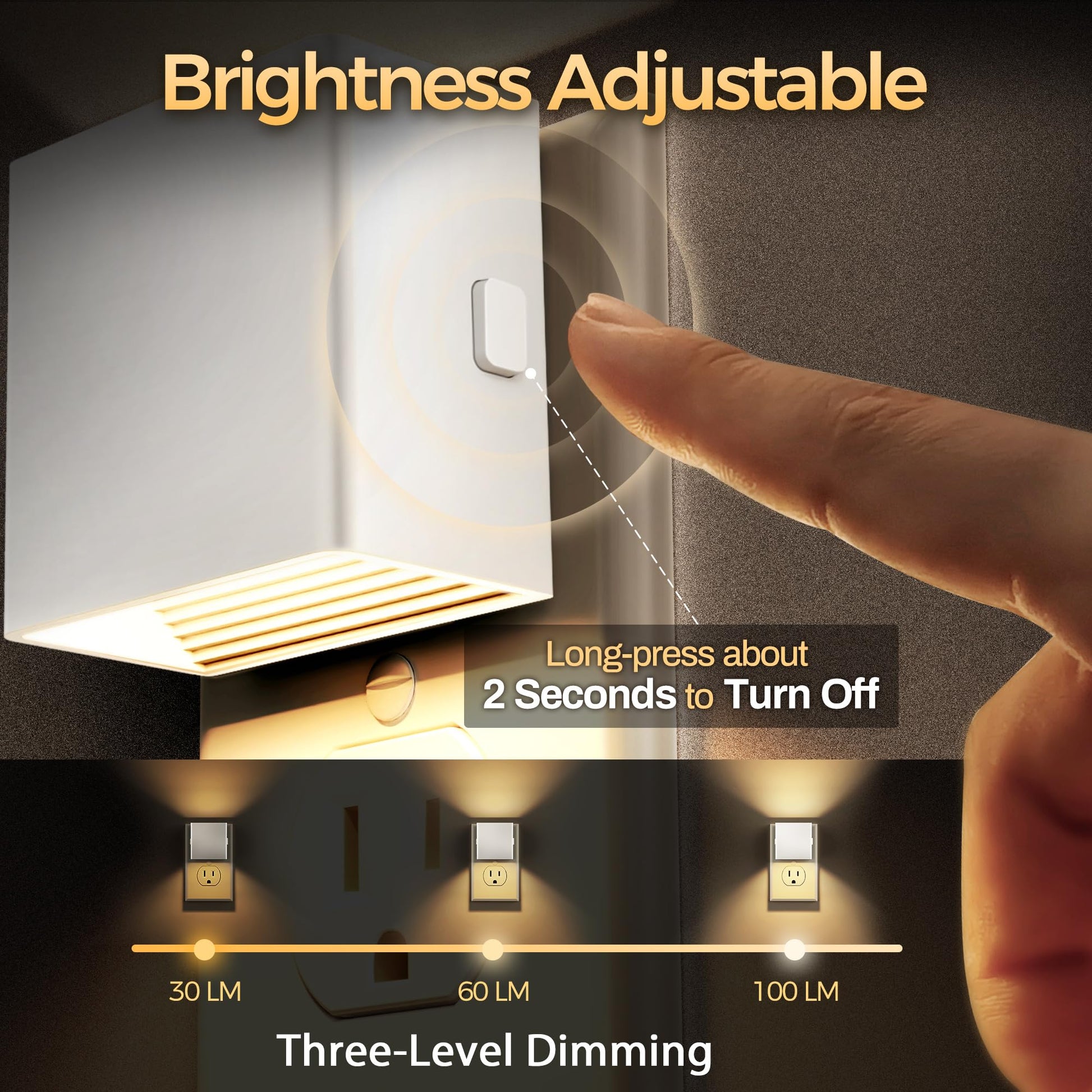 - 3 ADJUSTABLE BRIGHTNESS LEVELS FOR YOUR NEED: Take control of your lighting experience with three adjustable brightness levels, perfect for any situation. Whether you need a soft glow for relaxation or a brighter light for reading, our plug-in night light is designed to meet your needs