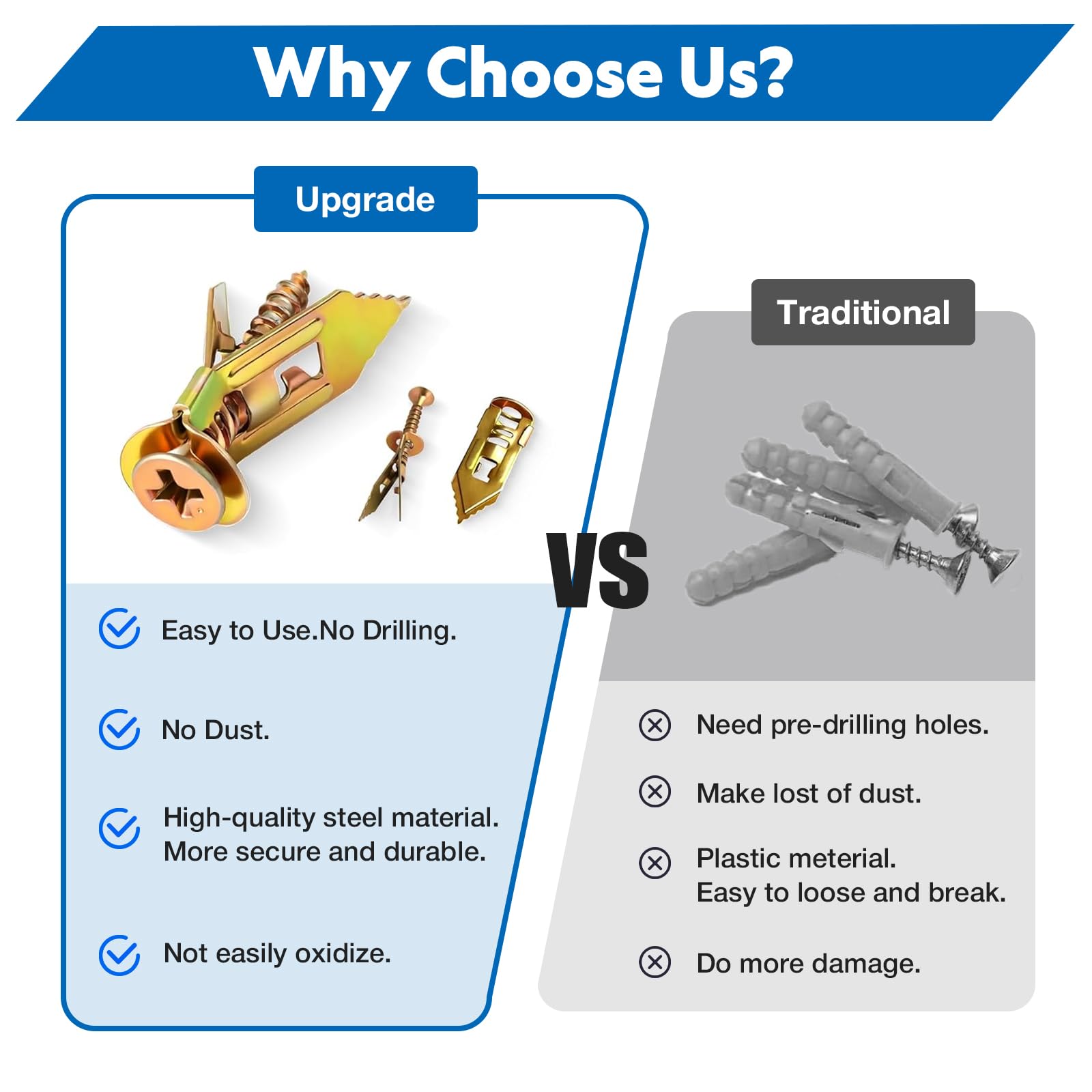 - Easy No-Drill Installation Self drilling anchors require no pre-drilling—just tap in, attach your item, and tighten for a secure hold without wall damage.