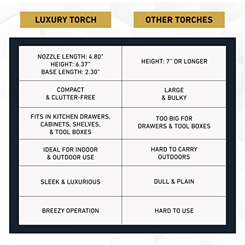 - A Luxurious Gift They Can¡¯t Beat: Available in 4 sophisticated colors, our handheld kitchen torch for baking boasts a portable, sleek design that will look fantastic on your shelf or cabinet. This butane cocktail torch also comes in a deluxe gift box, making it a beautiful present to your fellow creatives.