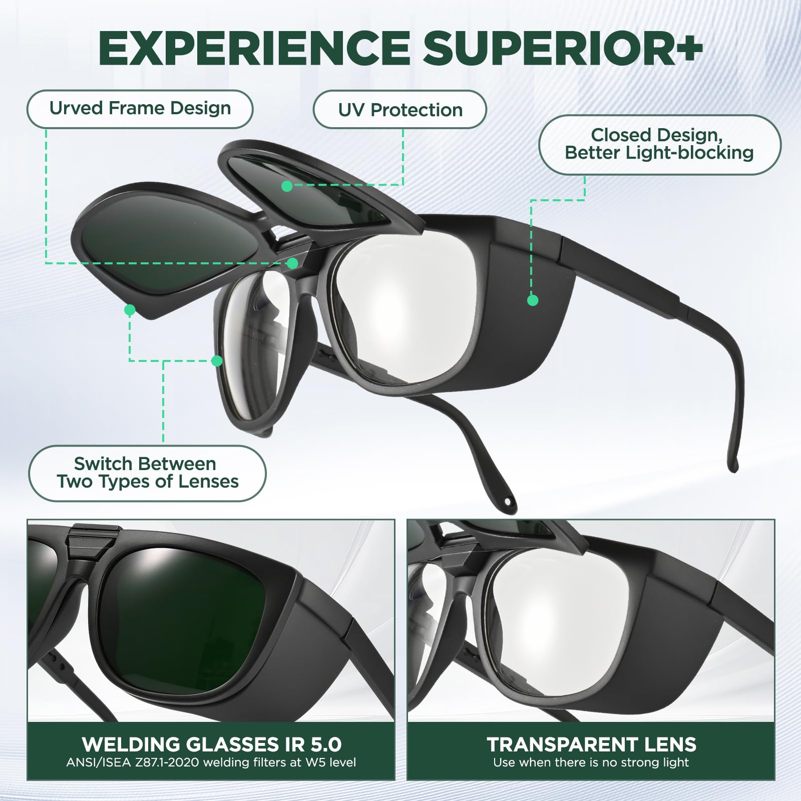 Dual Lens Welding Safety Glasses – ANSI Z87.1 Certified – Switch Between Clear & IR 5.0 Shade – Anti-Fog & Scratch Resistant – Adjustable Frame – UV400 Protection – for Arc Welding, Plasma Cutting