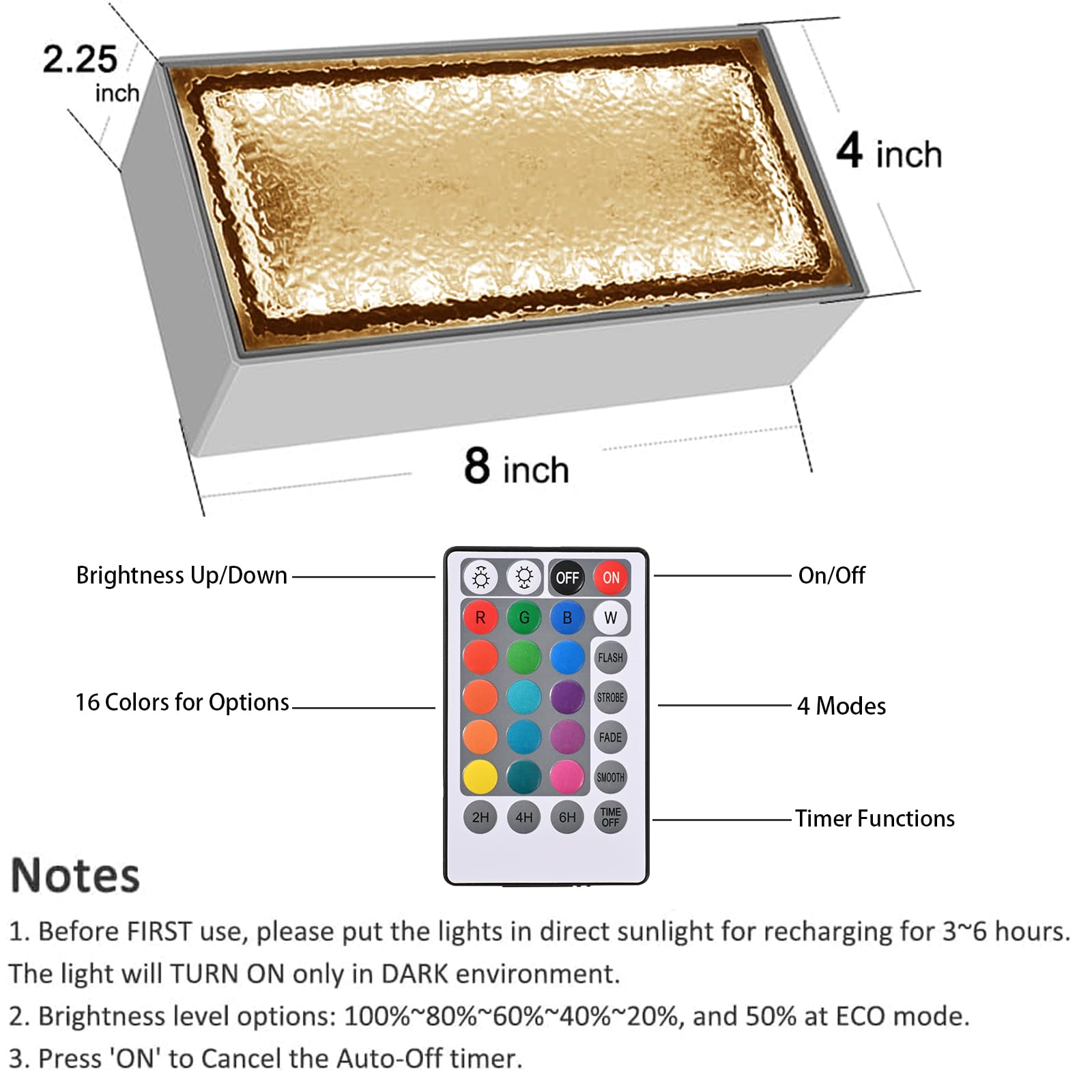 - Solar Powered Brick Light: High-efficiency solar panels charge in 6–8 hours of sunlight and provide 10–12 hours of illumination. Built-in light sensor automatically turns lights on at night and off at dawn. Note: If they don’t turn on automatically, use the included remote. Keep in mind, the lights only activate in darkness or at night