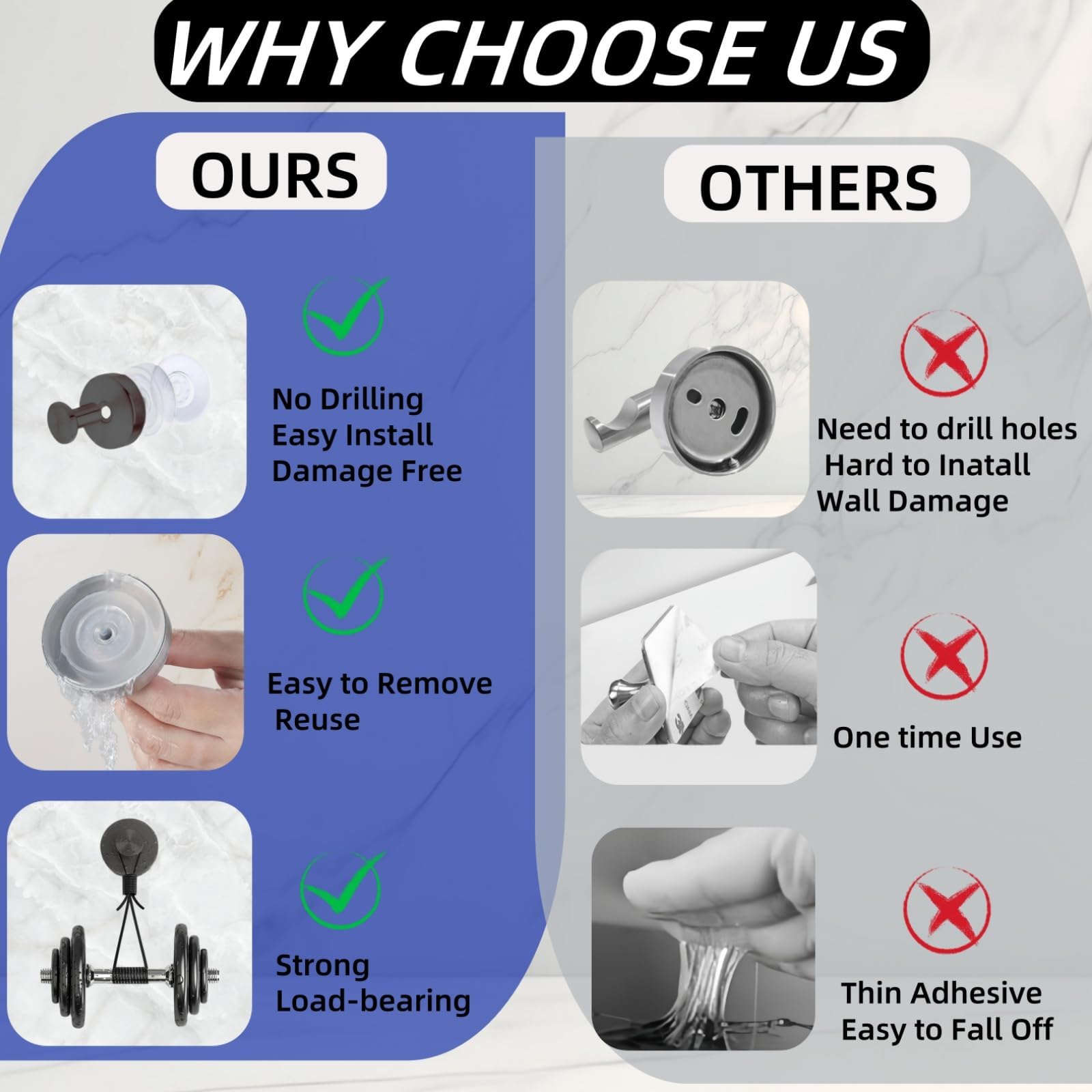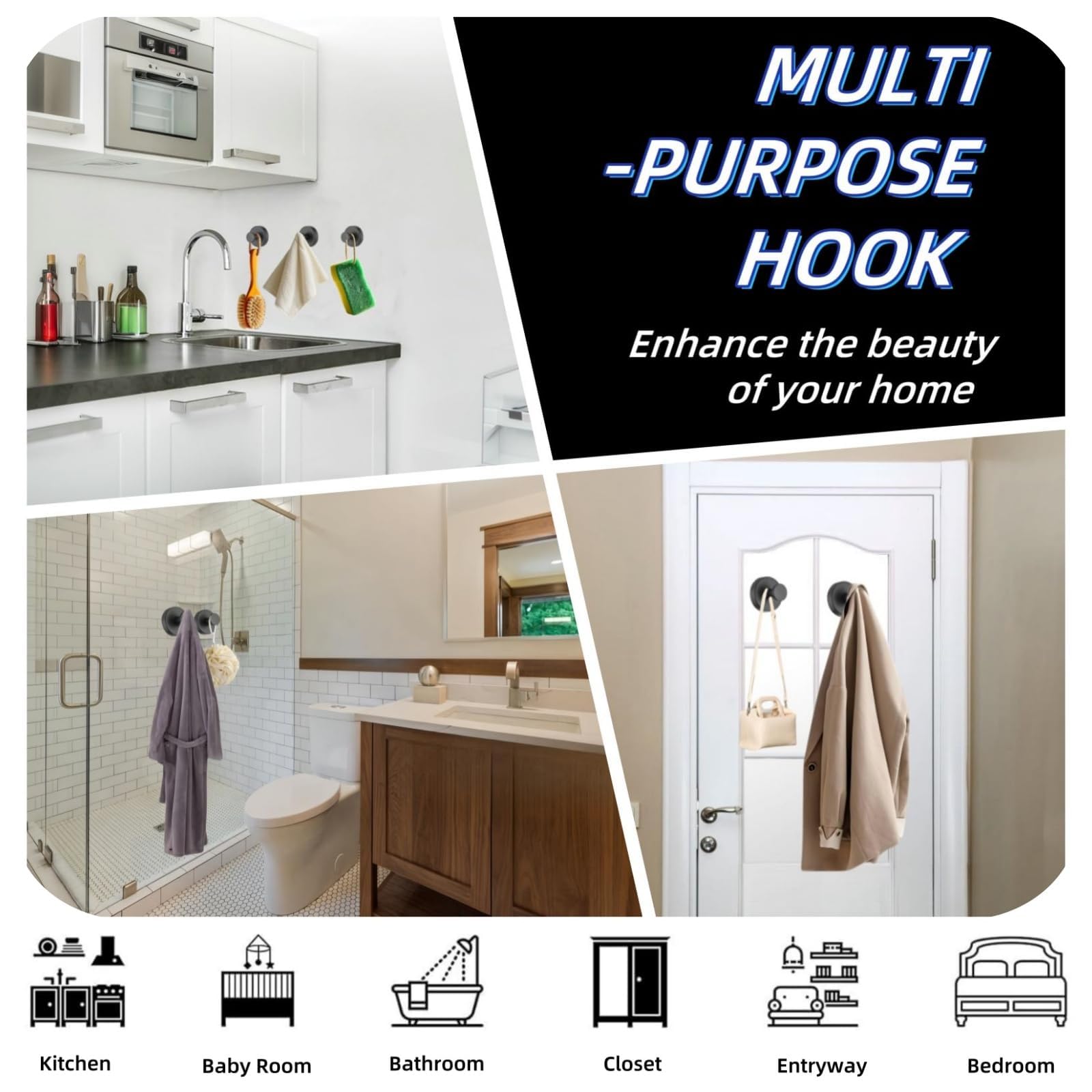 - Functionality Meets Style:Vacuum suction technology,sleek, minimalist design, the suction hooks for shower wall or front door provide both functionality and modern aesthetics. Ideal for holding towels, loofahs, and shower caddy in bathrooms, kitchen, hotel
