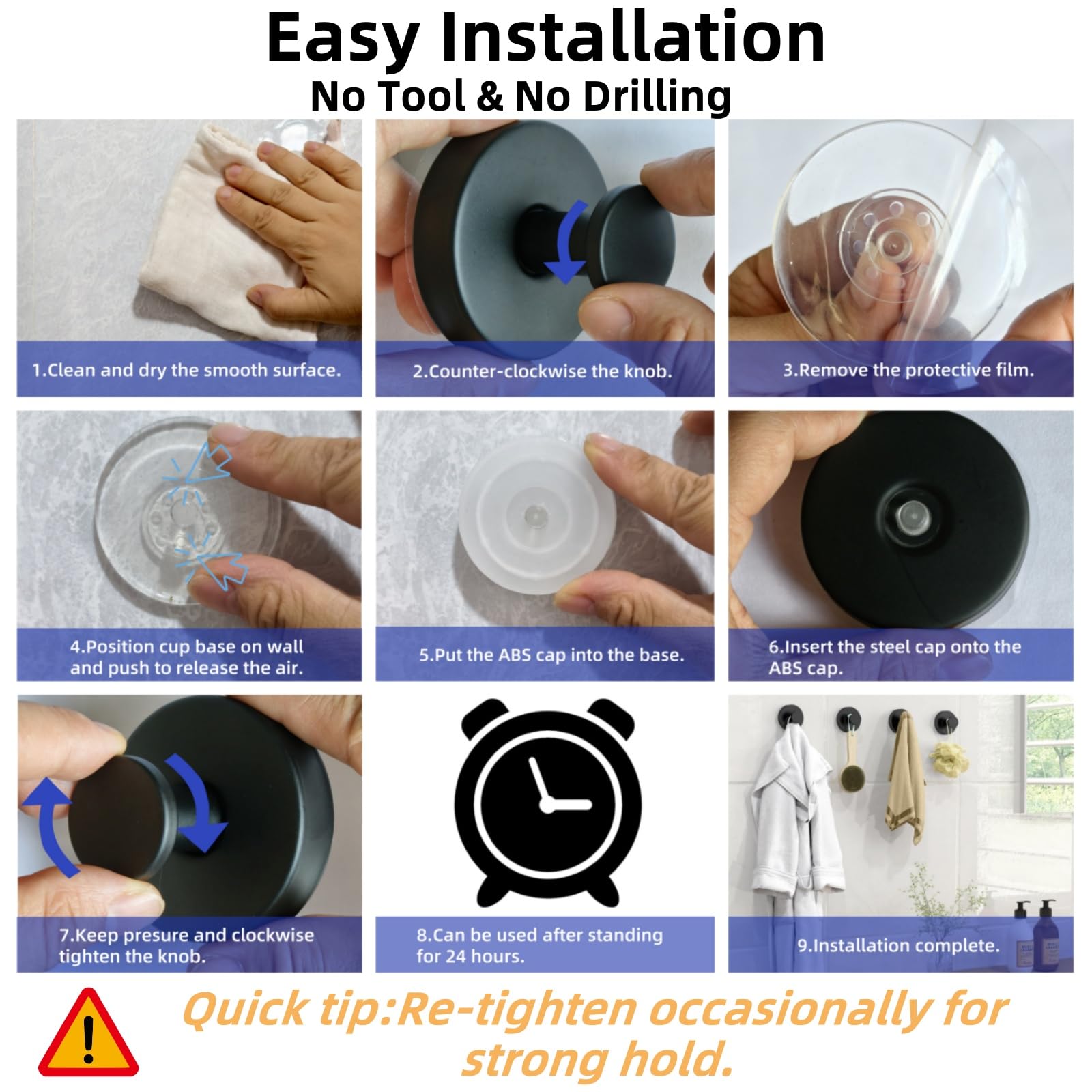 - Easy Installation Damage-Free:The bathroom hooks for shower installation require no drilling. Simply turn the knob clockwise to fix and press the robe & shower hooks attach to smooth surfaces,leaving no marks or residue