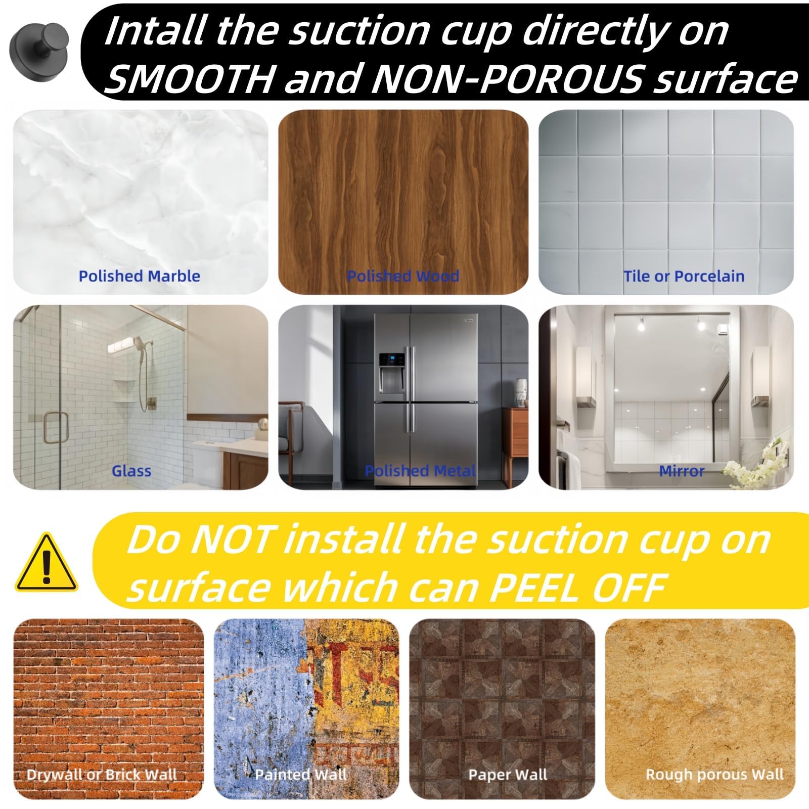 - Applicable Surfaces:Must know information before installation.The shower towel hook only works on dry and smooth surface,such as glass,mirror,tile,marble,metal .Suction cup towel hook cannot be suitable for rough surface,water paper,painted wall