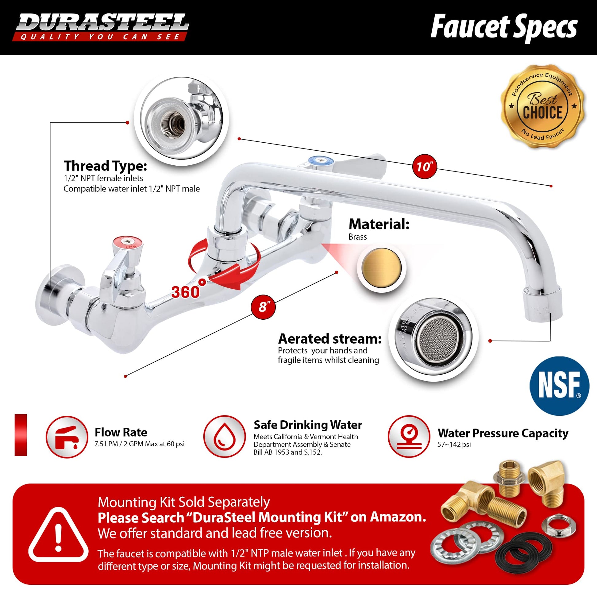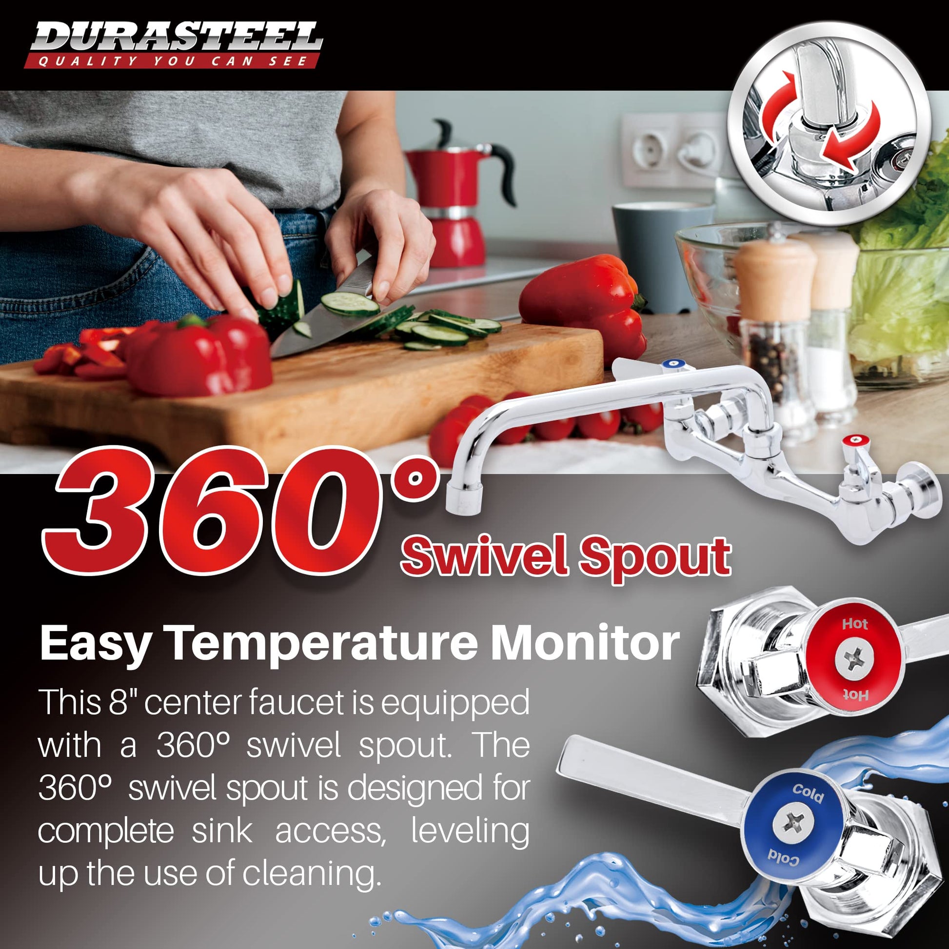 DuraSteel Commercial Kitchen Sink Faucet - No Lead 8" Center Wall Mount Utility Sink Faucet with 10'' Swivel Spout - NSF Certified - Dual Lever Handles - Brass Constructed & Chrome Polished