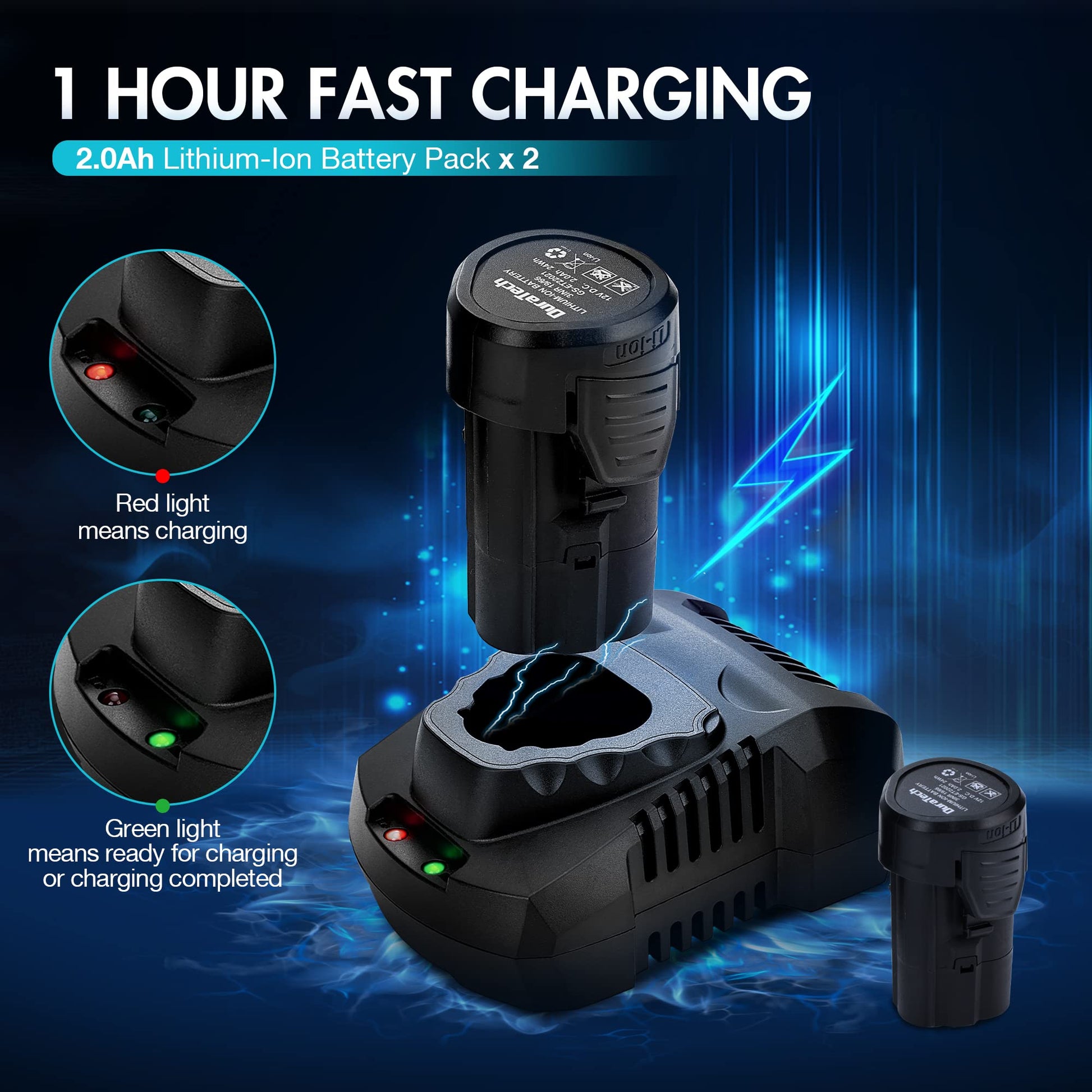 - What You Will Get: 1 * 12V 3/8" Ratchet Wrench; 2 * 2.0Ah Lithium Battery; 1 * 1 Hour Quick Charger; 1 * User Manual; 8 * Cr-V Hex Standard Sockets (11/32"、3/8"、7/16"、15/32"、1/2"、9/16"、5/8"、11/16"); 1 * 3/8" to 1/4" Drive Adapter; 1 * 3" Extension Bar; 1 * Carrying Case. 2.0Ah rechargeable lithium-ion battery is equipped with a 1-hour fast charger, and two batteries can be used alternately, greatly improving work efficiency. If you have any questions, please feel free to contact us
