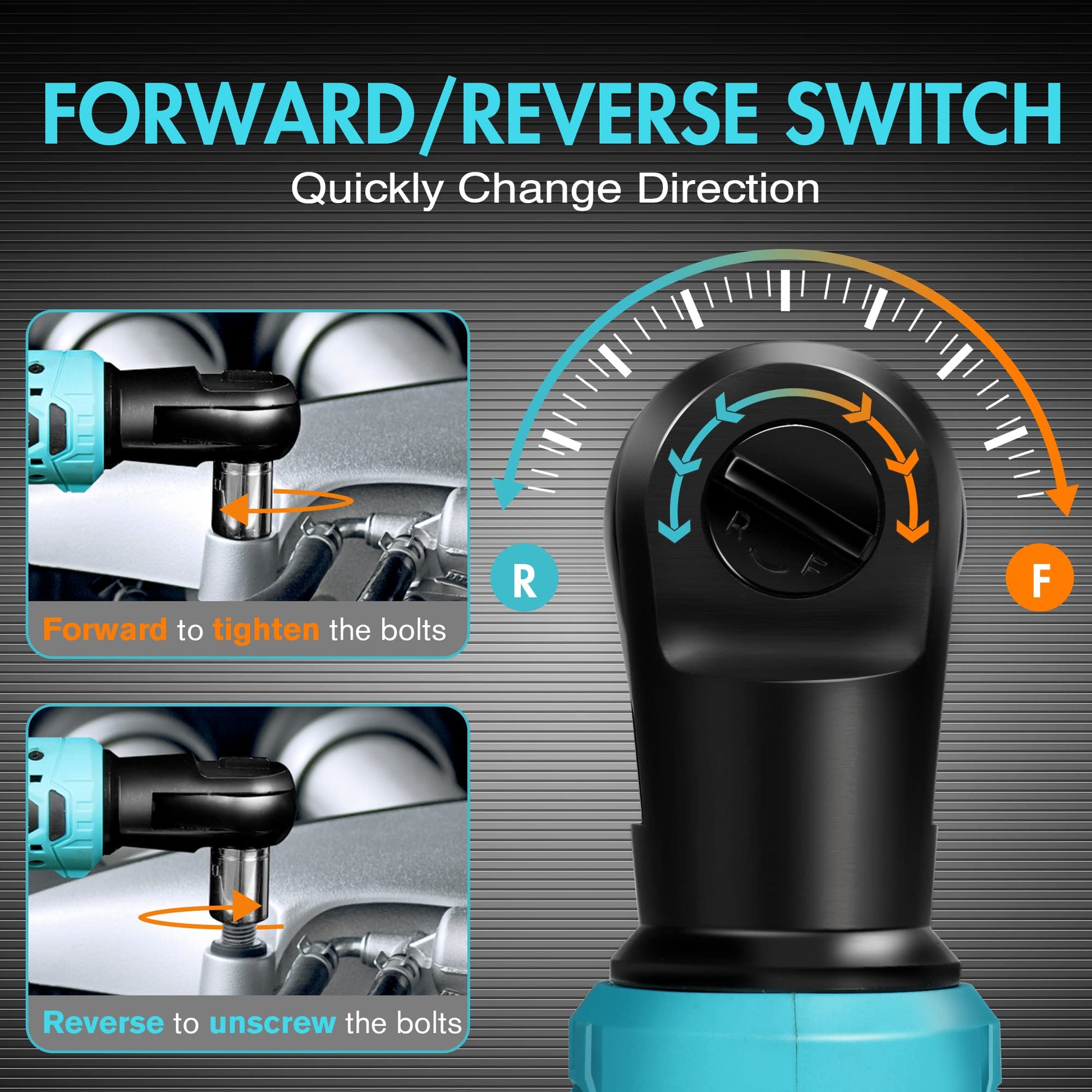 - Variable Speed & Safety Lock: 3/8" ratchet wrench is equipped with a variable speed trigger of 0-180 PRM, the speed can be adjusted by controlling the pressure applied on the trigger to achieve precise torque control and different needs in assembly and maintenance. A forward/reverse switch on the back of the head enables clockwise or counterclockwise rotation, allowing you to easily tighten or loose bolts. The safety lock design prevents accidental activation