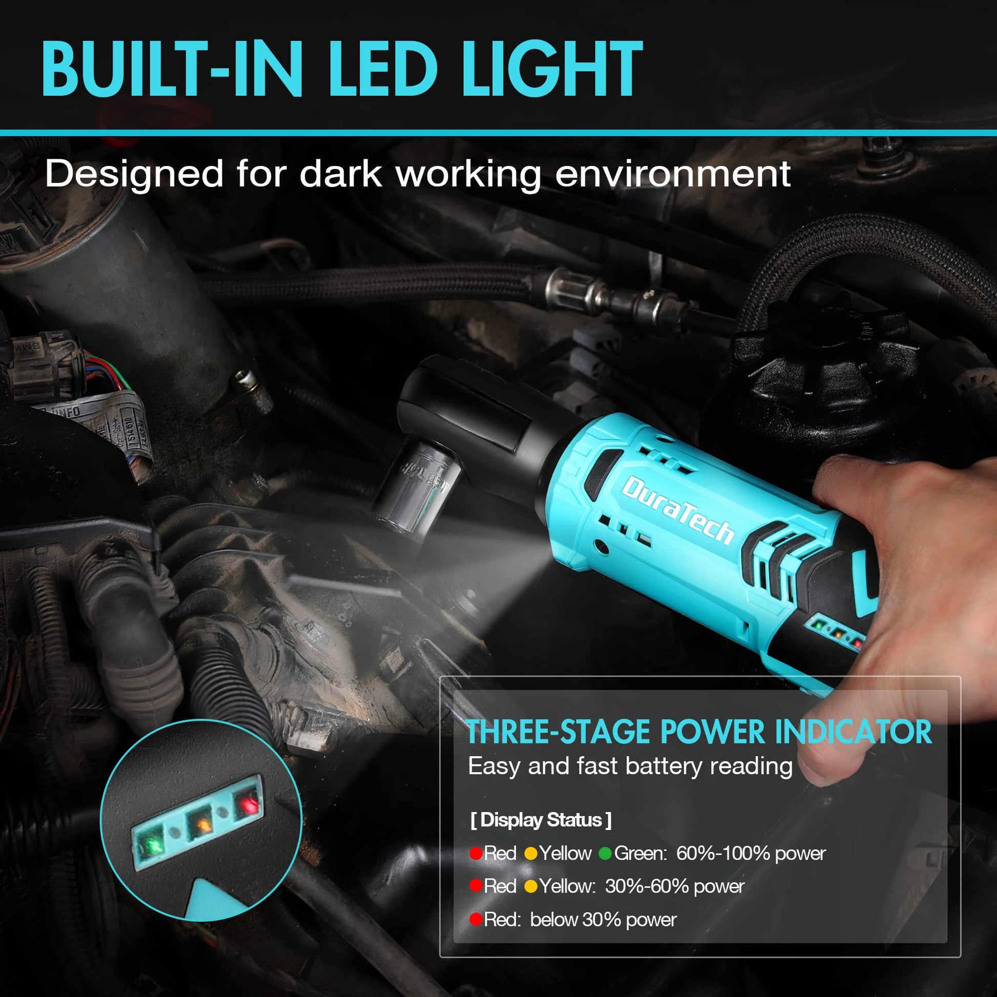 - Built-in LED & Power Indicator: Three-color LED light indicates the remaining battery power, and thoughtful design can remind you when you need to recharge the ratchet, don't worry about power ratchet wrench set suddenly stopping while working. 12V ratchet has a built-in LED work light, which can illuminate the dim working environment in any confined area, allowing you to work easily at night to easily tighten or loosen nuts. Suitable for home, industrial, amateur and professional use