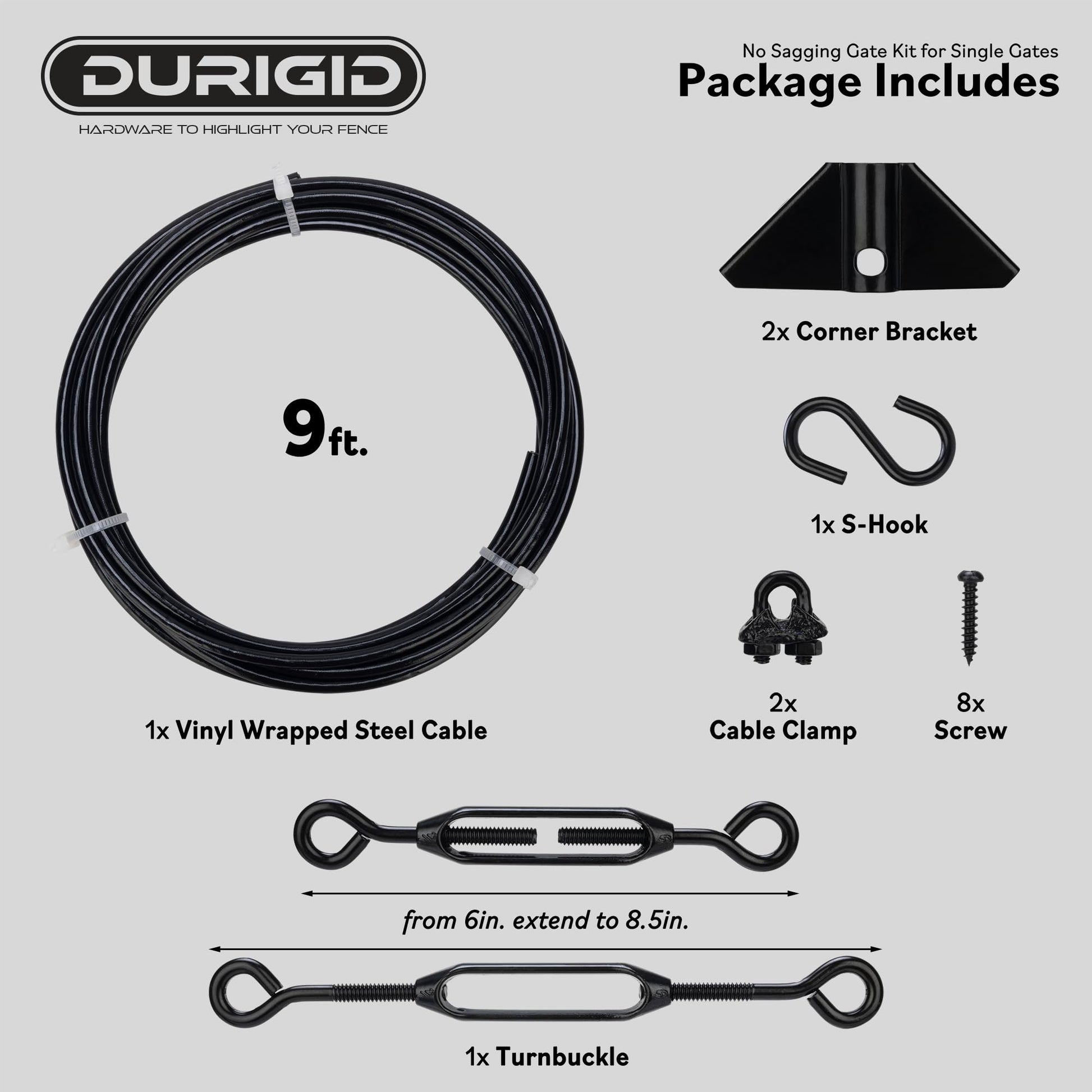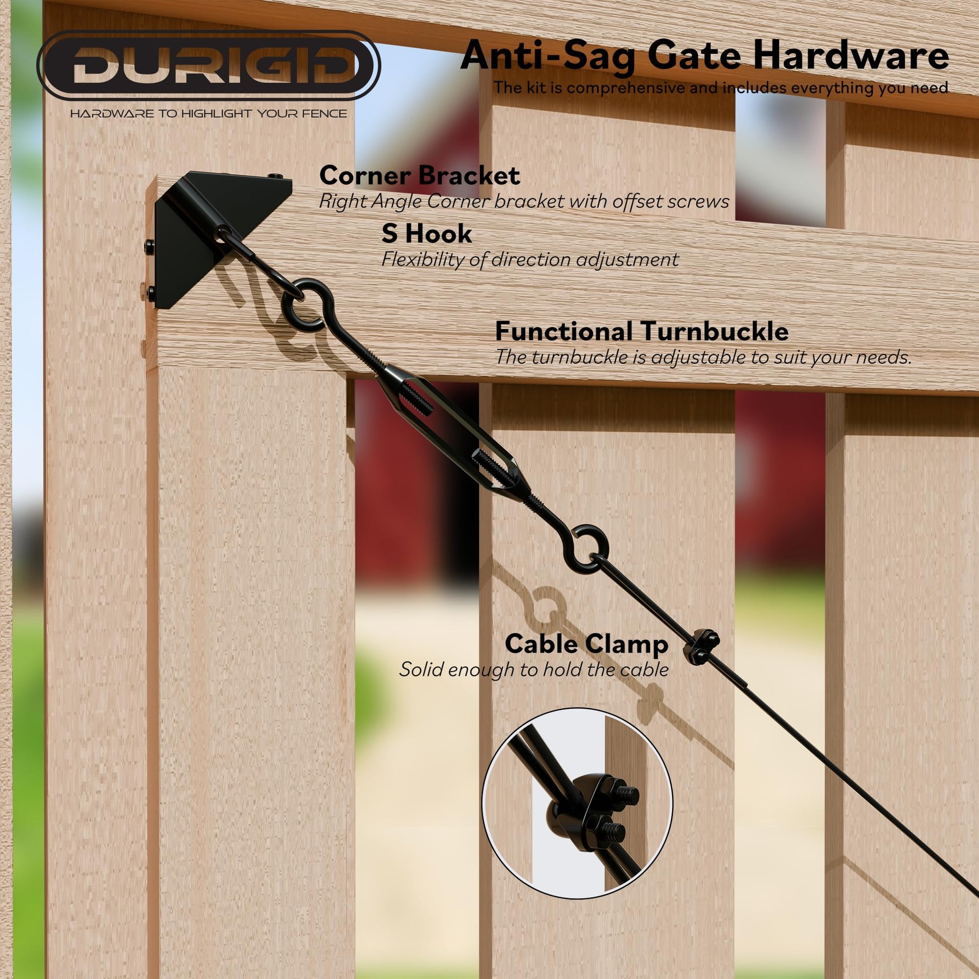 - 【Versatile Application】DURIGID anti sag gate kit is not only great for fixing sagging gates but also versatile enough for other hanging needs, including string light hanging, cable railing, and trellis wire installations