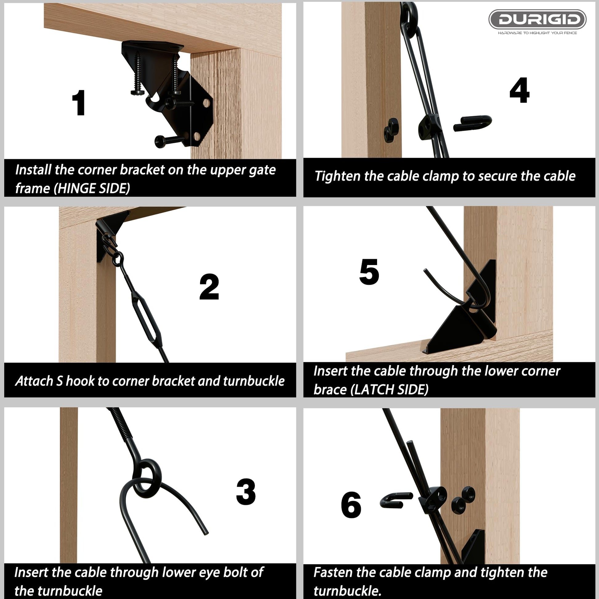 - 【Prevents Gate Sagging】The corner brackets are securely attached to the corners of the gate, providing robust support for the gate and preventing sagging. By tightening the turnbuckle, the steel cable is pulled taut, relieving the weight from the top hinge and lifting the gate to a more level position
