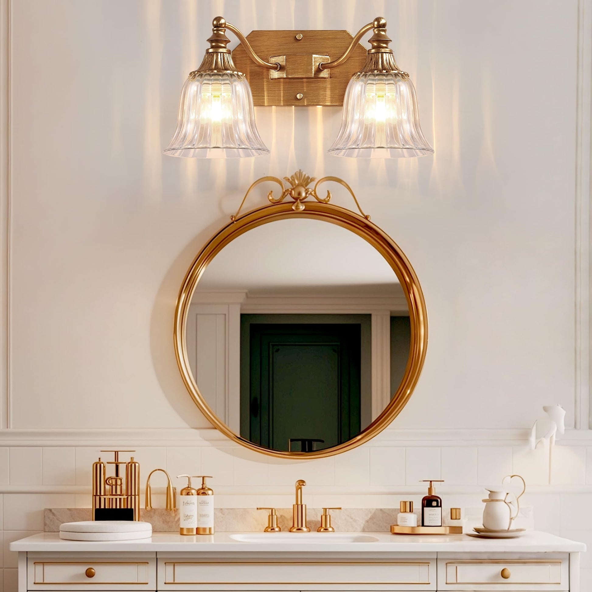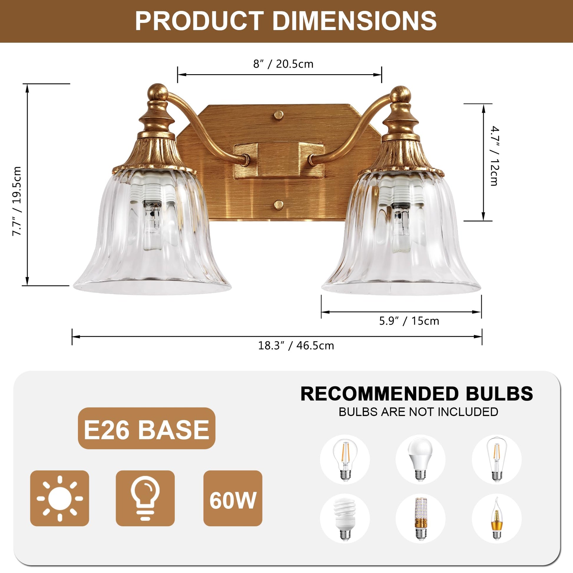- Vintage Gold Craftsmanship: The gold bathroom light fixtures feature a hand-painted gold finish crafted, paired with a transparent glass lampshade, giving a strong antique charm. The bathroom lighting fixtures over mirror are equipped with solid metal frame, ensuring long-term safety and reliability