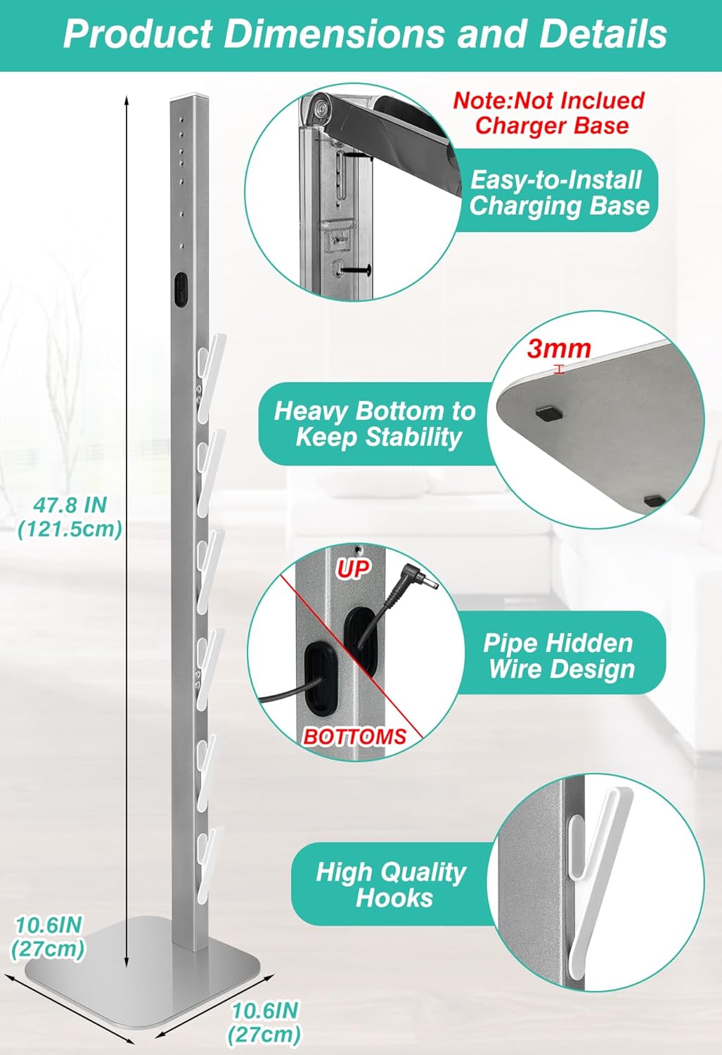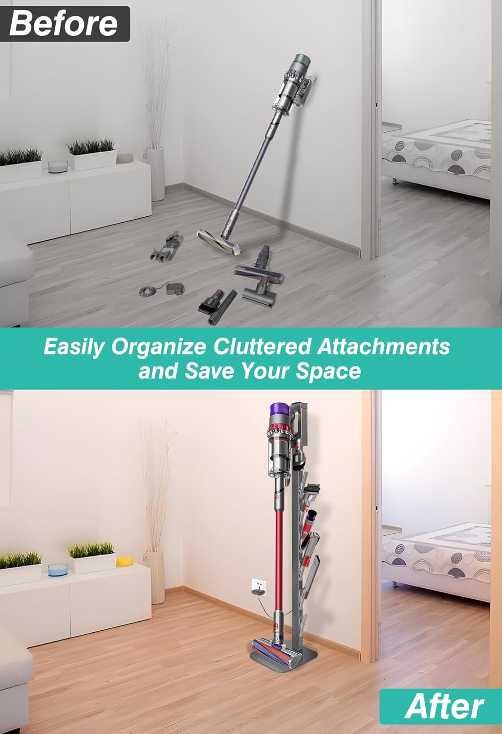 - 【Efficient Organization & Hidden Cord Design】: Featuring 4 hooks for storing accessories, this stand keeps all your vacuum tools neatly organized. The hidden power cord design runs the cord through the stand, creating a clean and clutter-free look