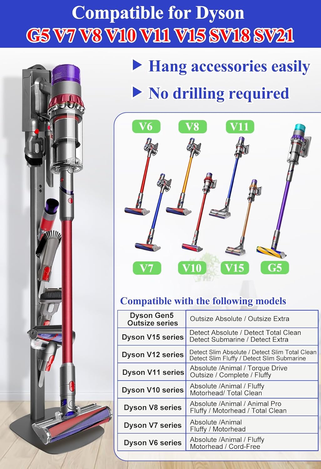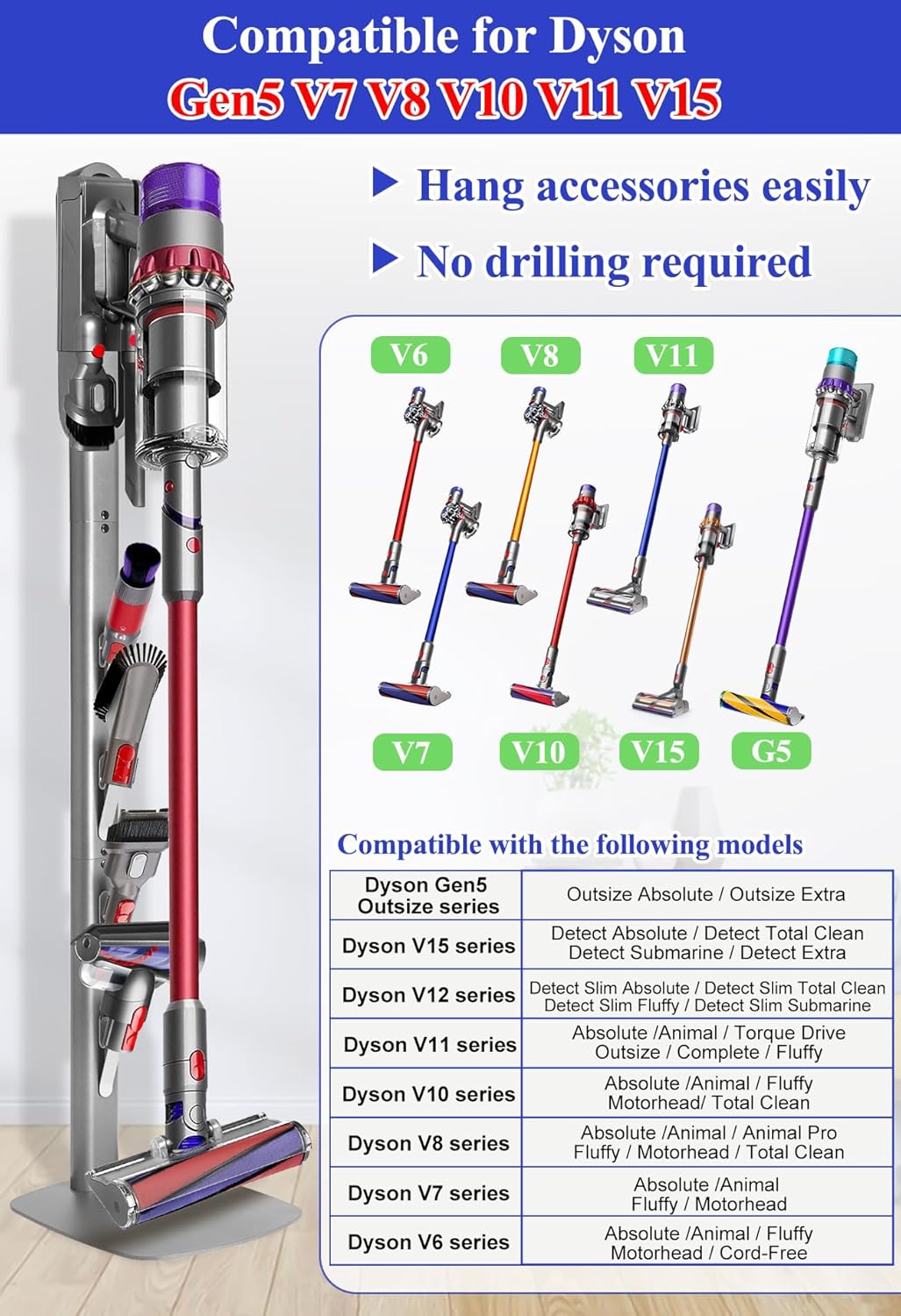 - 【Compatible Models】: This vacuum stand is compatible with Dyson Gen5 Outsize, V15 Detect, V12 Detect Slim, V11, V10, V8, V7, and V6 cordless vacuum cleaners. It provides a simple and efficient way to store your vacuum and accessories. Note: The vacuum, accessories, and charging dock shown in the images are for illustration purposes only and are not included. This listing is for the vacuum stand only