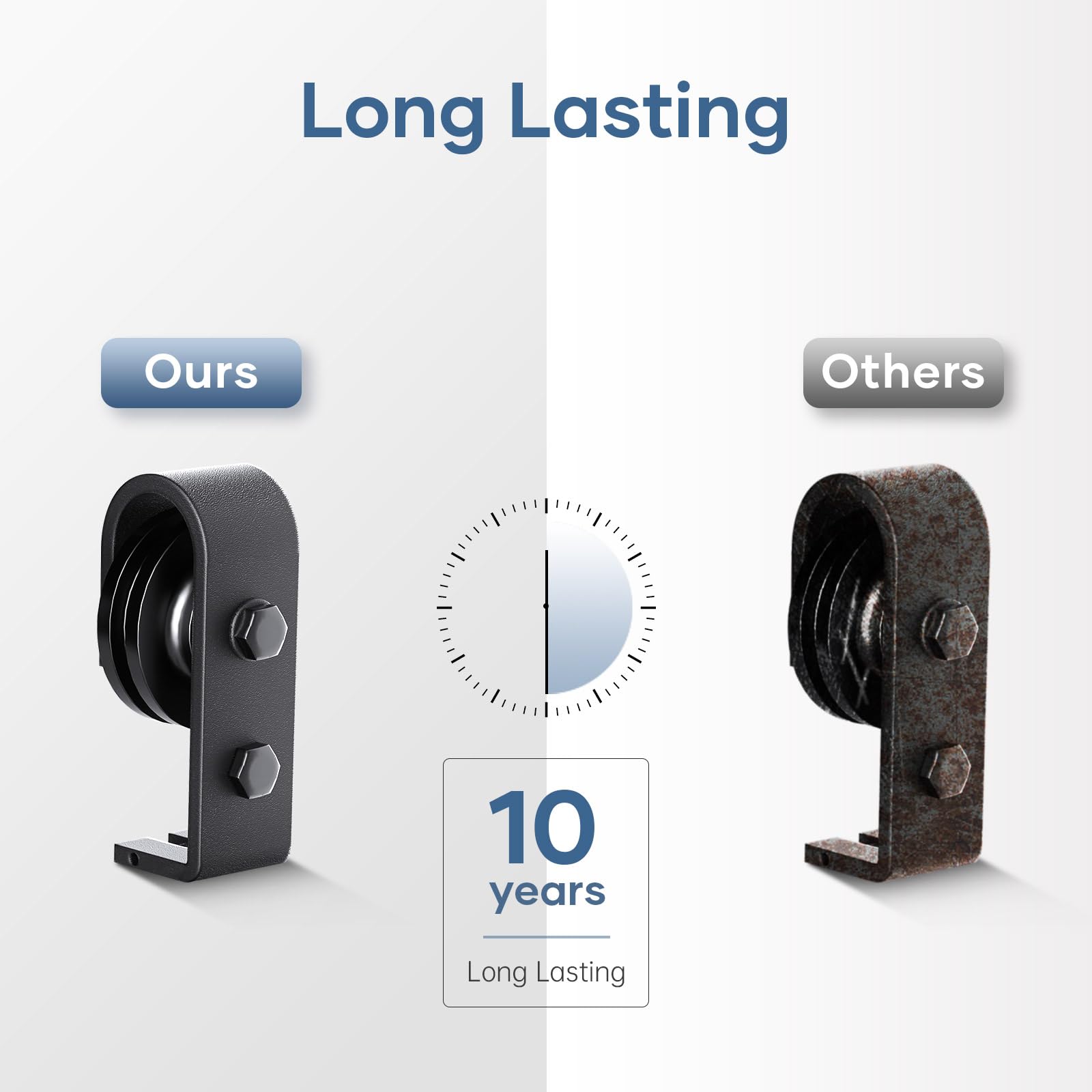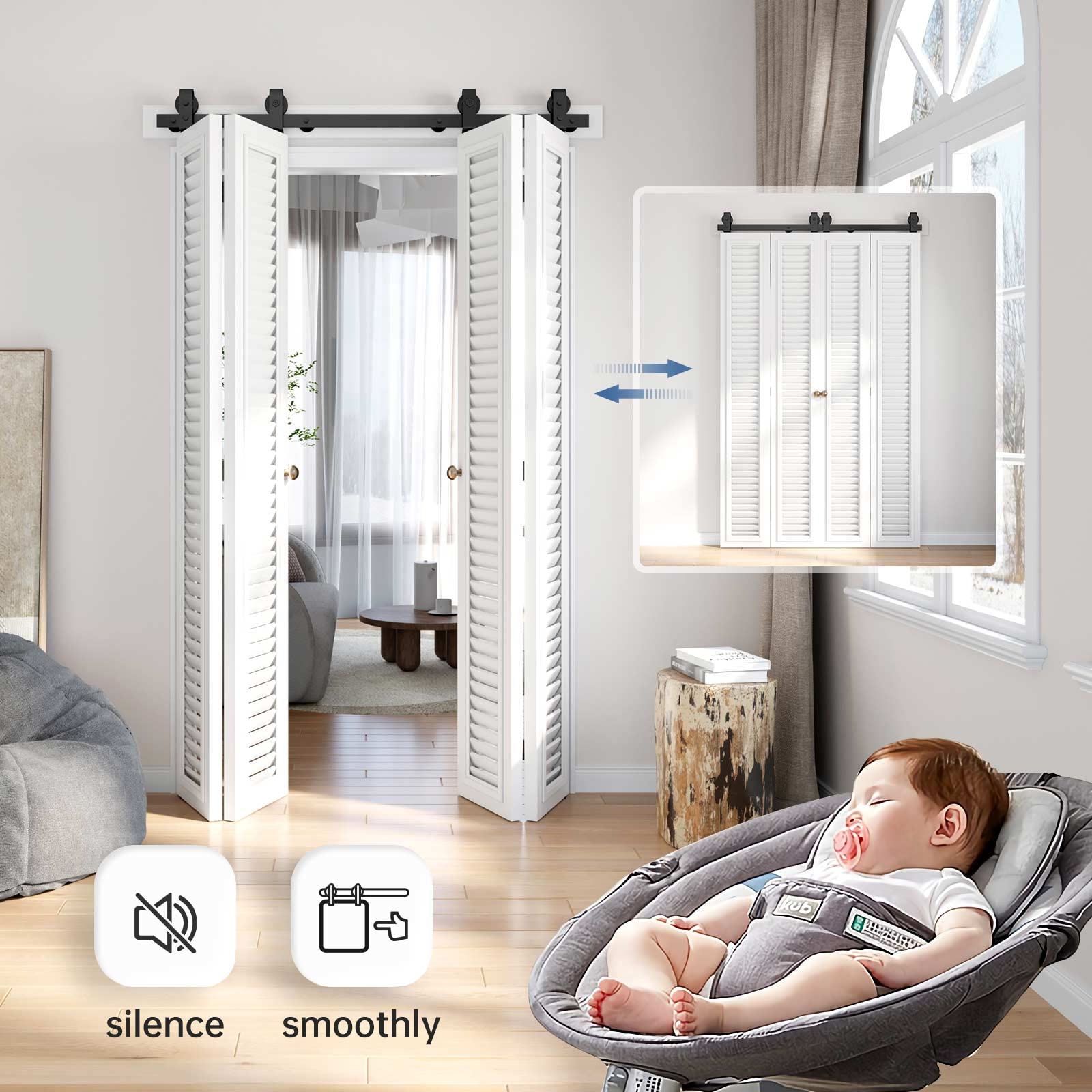 - Smooth Gliding Like Butter: Crafted from steel with a fine black powder-coated finish,our bifold barn door hardware resists corrosion for lasting durability.Features high-precision bearing rollers tested over 100,000 cycles for buttery-smooth,silent operation-rigorously inspected for reliability