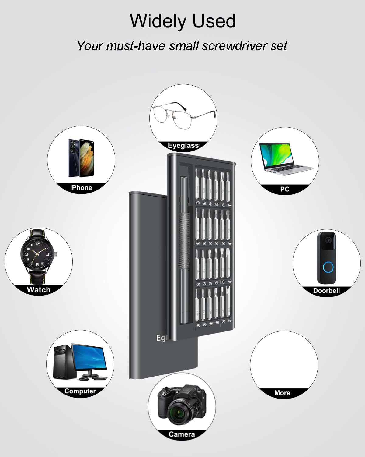 - [Wide Range of Applications] Micro screwdriver set is widely used for repairing or replacing parts of various gadgets in the home, for ring doorbell, glasses, watch, eyeglass, ring camera, pc, jewelers, computer, laptop, ps5, ps4, xbox, macbook, knife and more.
