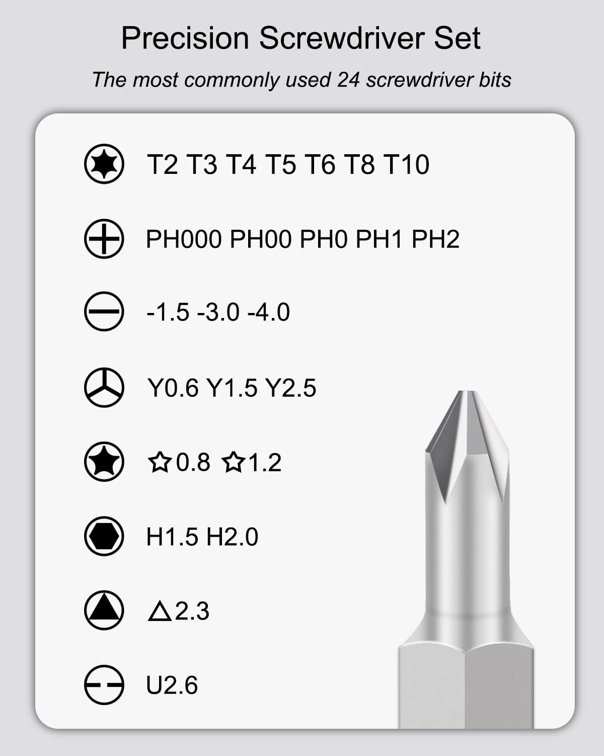 - [Repair Must-Have] Egmen small screwdriver set contains 24 different bits, with phillips (PH000, PH00, PH0, PH1, PH2), flat head (SL1.5, SL3.0, SL4.0), torx (T2, T3, T4, T5, T6, T8, T10) tri-point (Y0.6, Y1.5, Y2.5), pentalobe (P0.8, P1.2), hex (H1.5, H2.0), triangle 2.3, u-type 2.6.