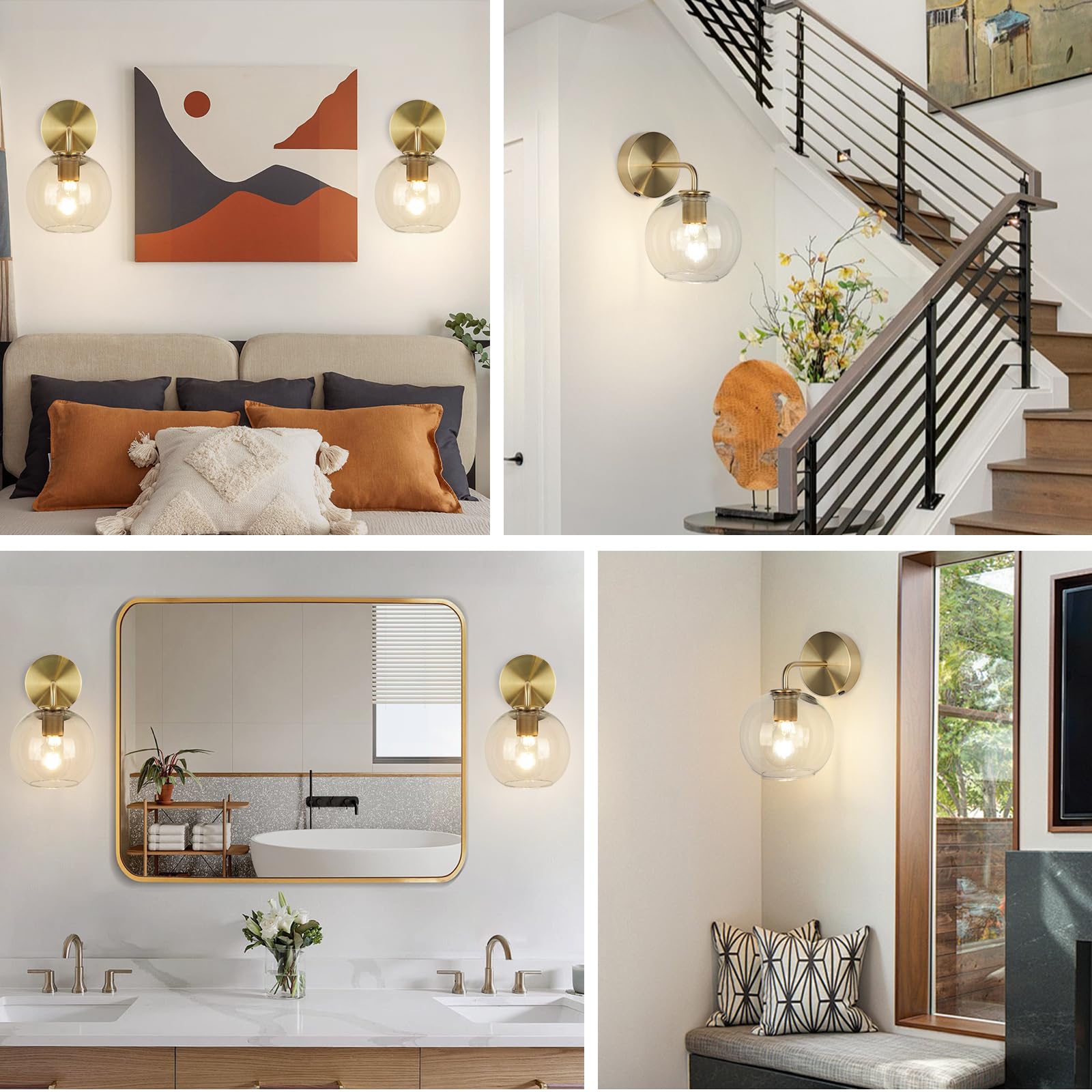 - 【Industrial Design】 Gold Vanity Wall Sconces design brings a modern atmosphere to your home. Metal lamp body with matte gold finishand and glass lampshade brings country style to your room. Stylish and minimalist, this not hardwired wall sconce is perfect for all modern interior scenes