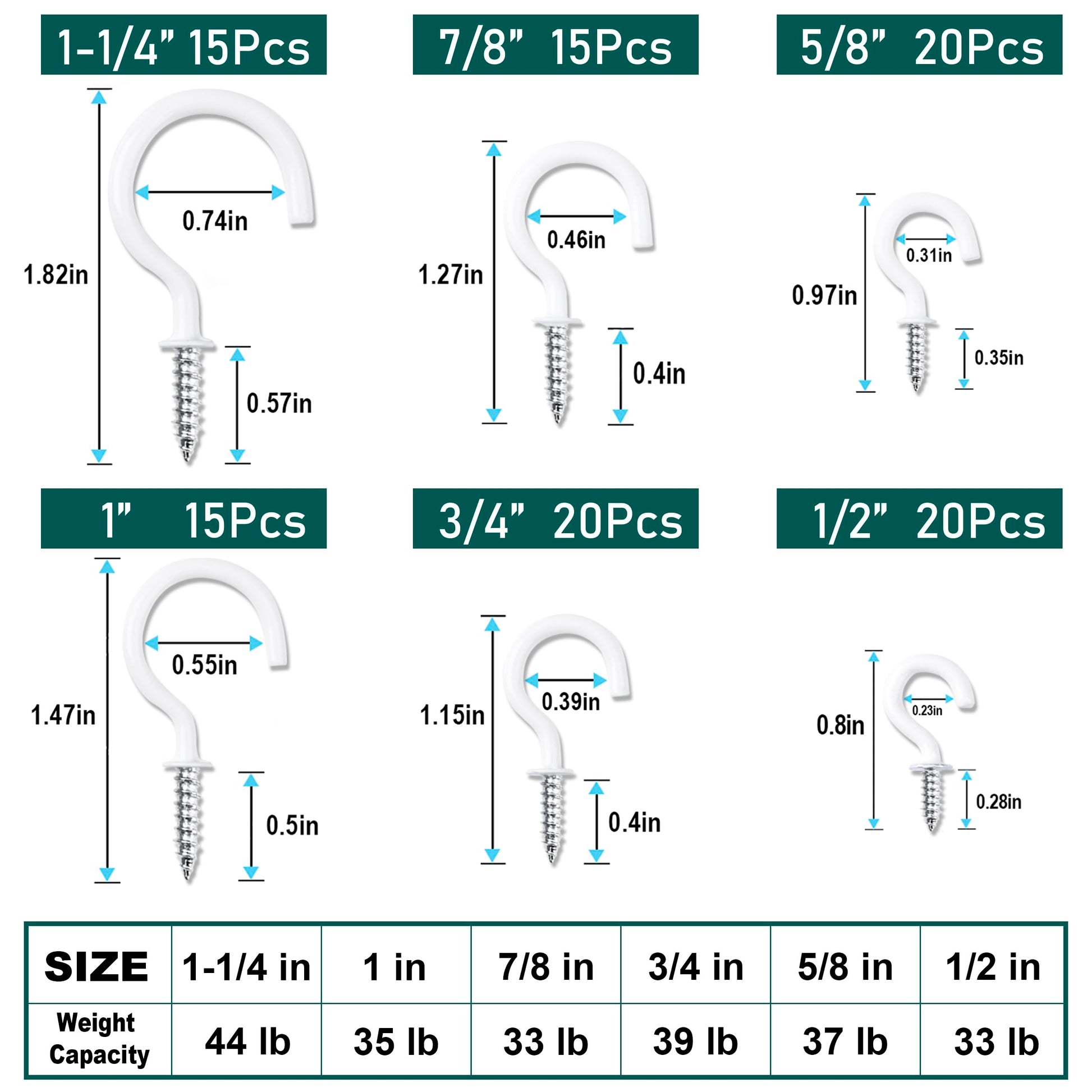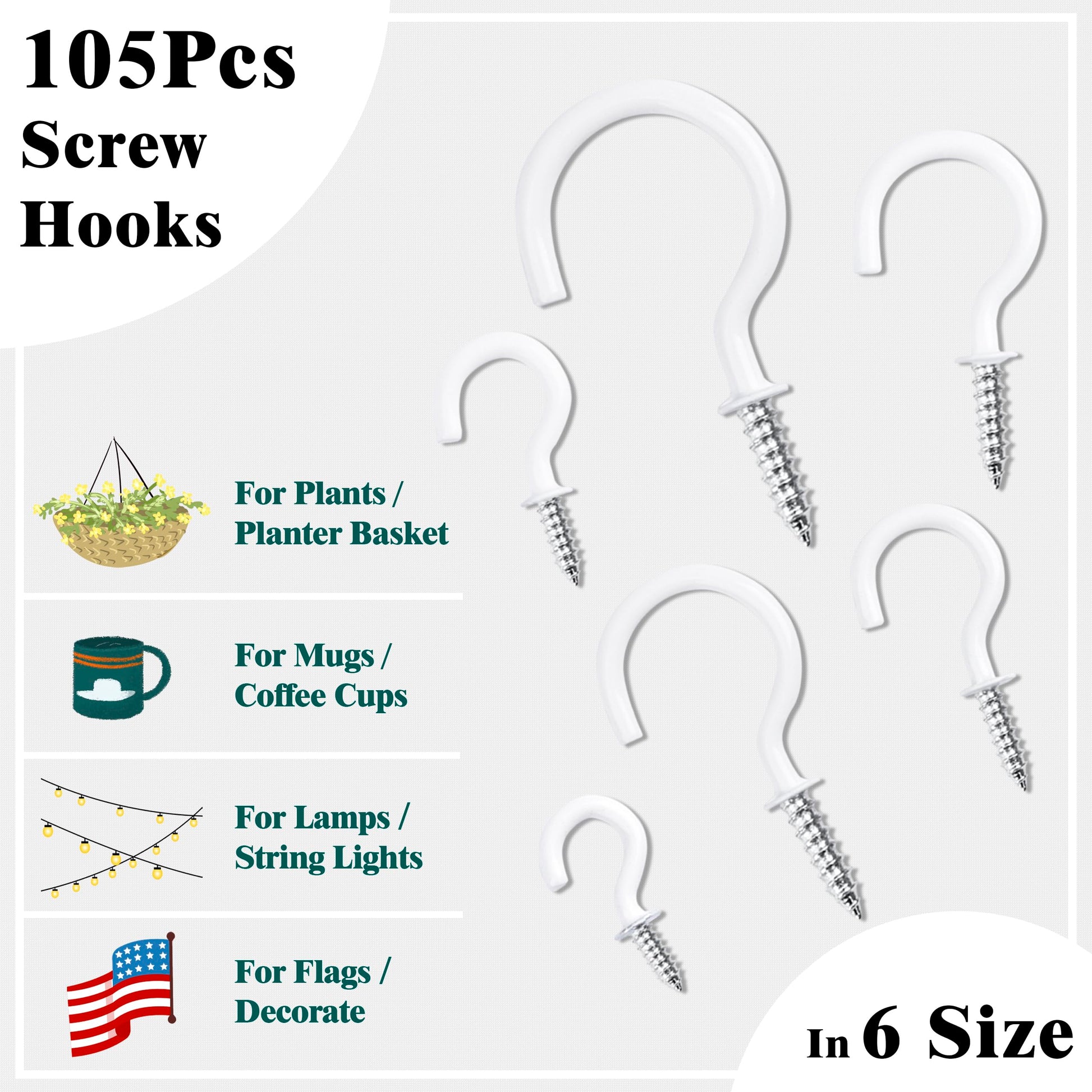 - 【Various Sizes】Small to large size screw hooks to meet your needs: 1-1/4 inch(15pcs), 1 inch(15pcs), 7/8 inch(15pcs), 3/4 inch(20pcs), 5/8 inch(20pcs), 1/2 inch(20pcs), 105pcs in total