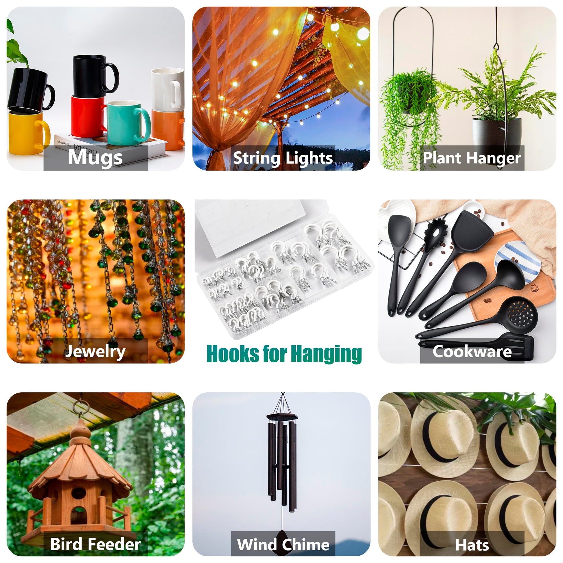 Use large-size screw-in hooks for hanging plants, flower baskets, mugs, clothes, towels, lamps, hats, kitchen utensils, and other heavy objects, while using small-size hooks for hanging necklaces, jewelry, and Christmas lights, keys, and other small decorations.