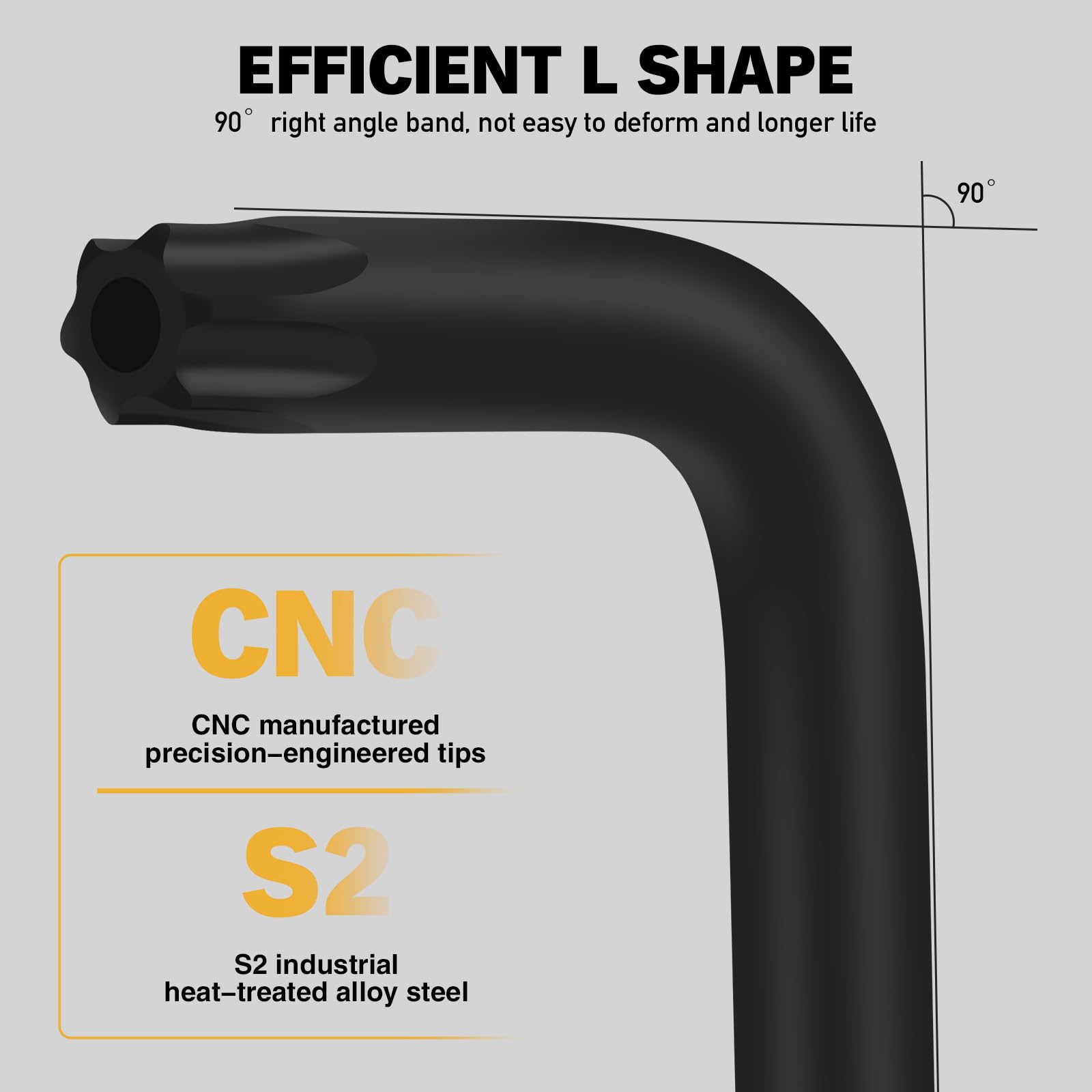- ERGONOMIC GRIP - Designed with an ergonomic handle for maximum comfort and control, this torx key set reduces hand fatigue during extended use. Anti-slip surface ensures a secure hold, allowing you to work with precision and ease.