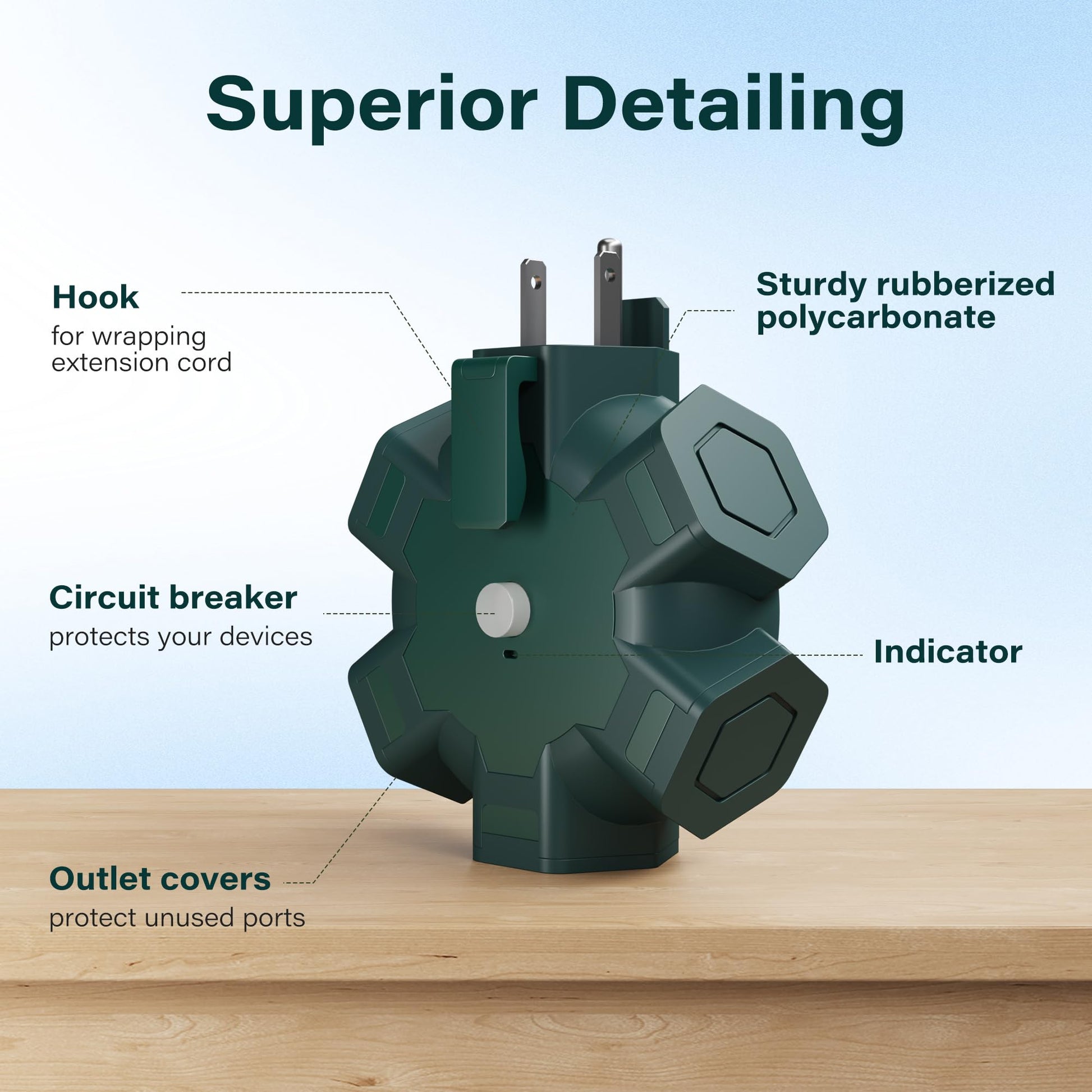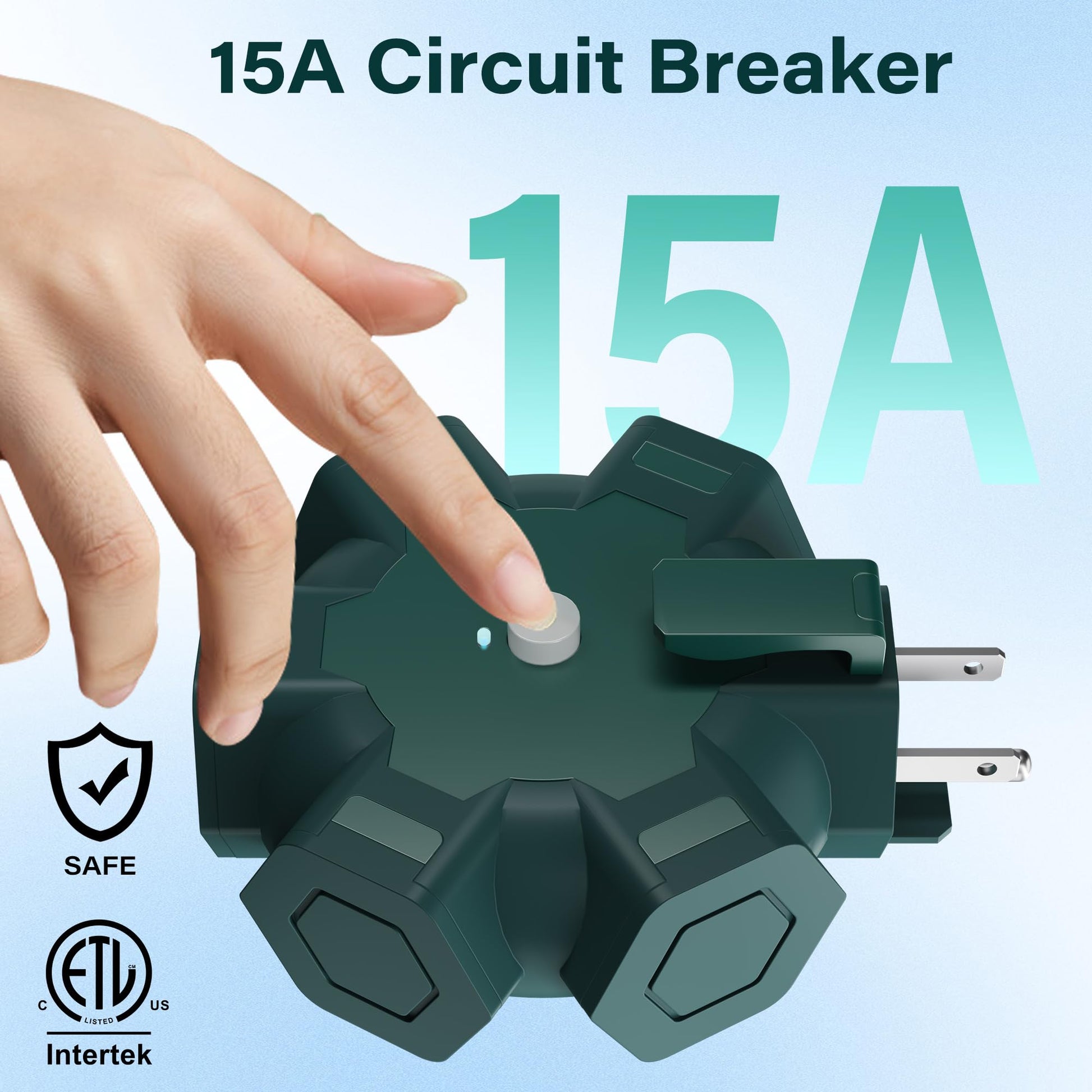 Elecan Outdoor 5-Outlet Power Splitter Plug Extender Hexagonal Hub Adapter with Safety Covers, 3 Prong Grounding Widely-Spaced with 15A Circuit Breaker&Indicator for Holiday Jobsite Garage-ETL-Green