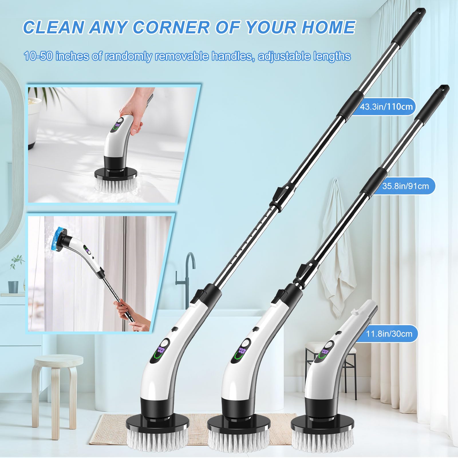 - 【EASY TO ASSEMBLE & ADJUSTABLE HANDLE】This Shower Scrubber is very easy to assemble, just simply rotate it to the length you want. The retractable handle (35.8“-43.3”) allows you to clean shower walls, bathtubs and high tiles without bending or stretching. Featuring an ergonomically designed handle with a comfortable grip, it feels effortless to clean even for long periods of time.