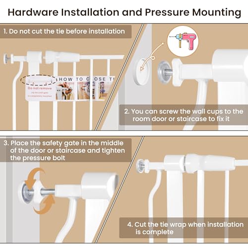 - Easy Installation: Simple pressure mounting takes approximately 15 minutes to install without assistance while protecting your walls. Notice: DO NOT cut off the zip tie on the gate before installation is completed, or the gate will completely broken and is unusable