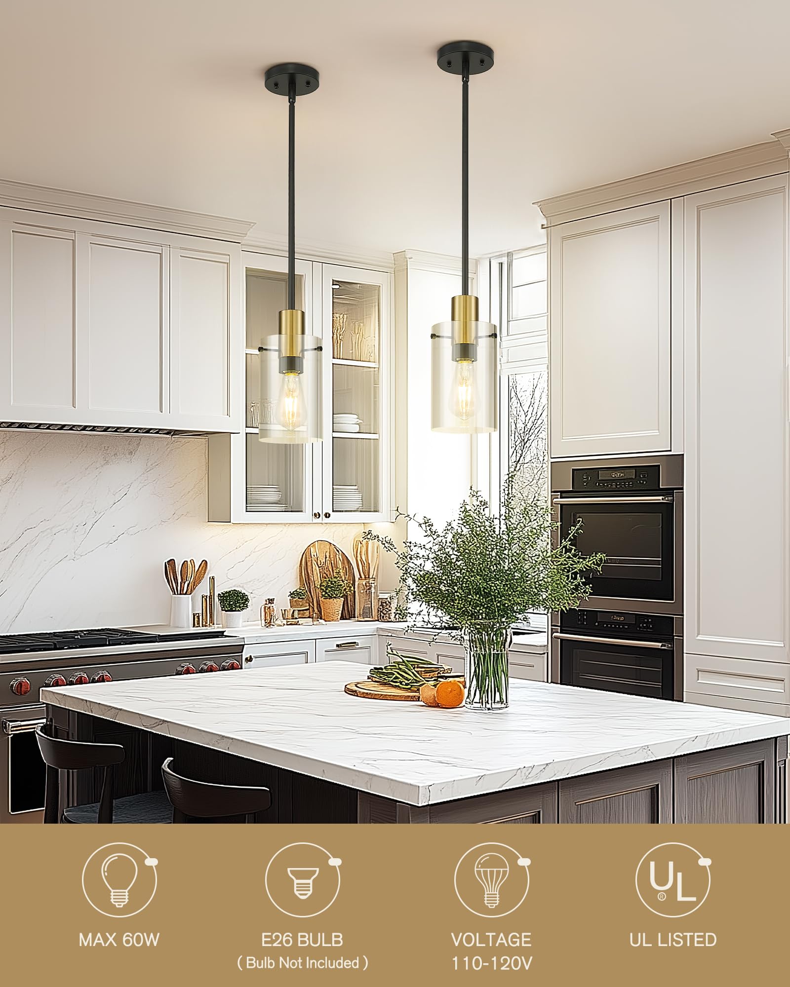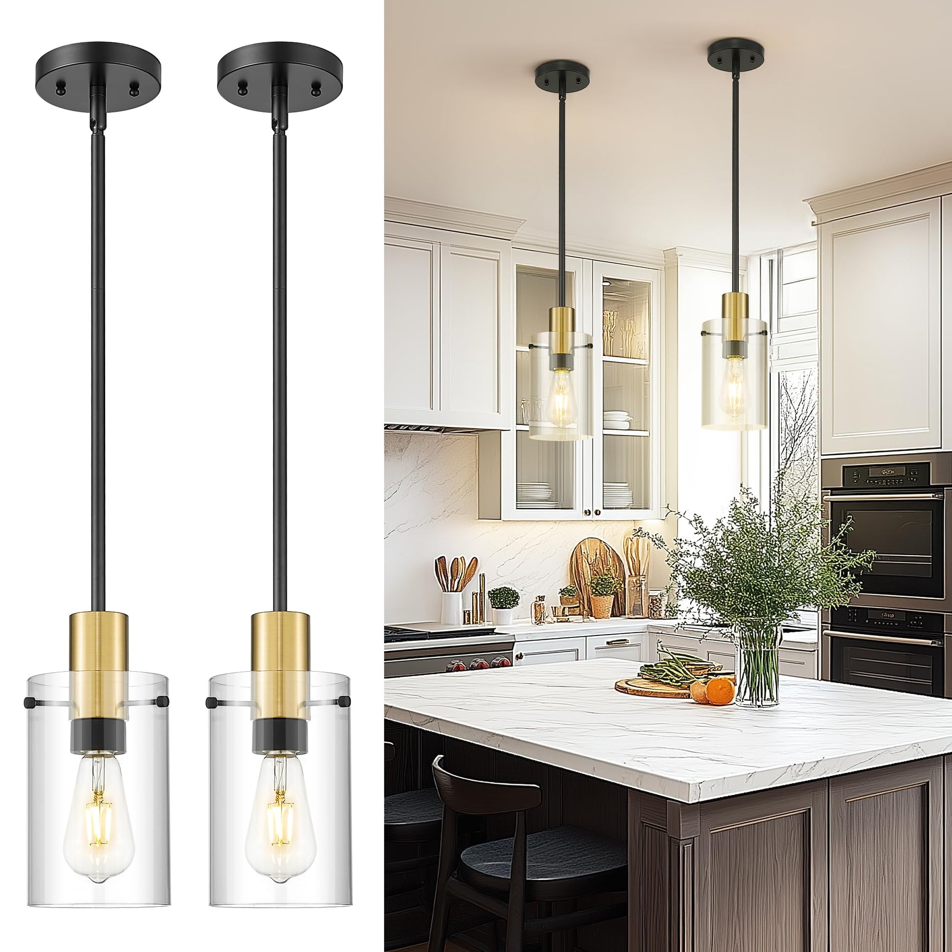 Emak 2 Pack Black and Gold Pendant Light,Modern 5 Inch Pendant Lights Kitchen Island with Clear Glass Shade, Farmhouse Kitchen Island Lighting for Dining Room, Bathroom, PL127-BKBGD-CG-2PK