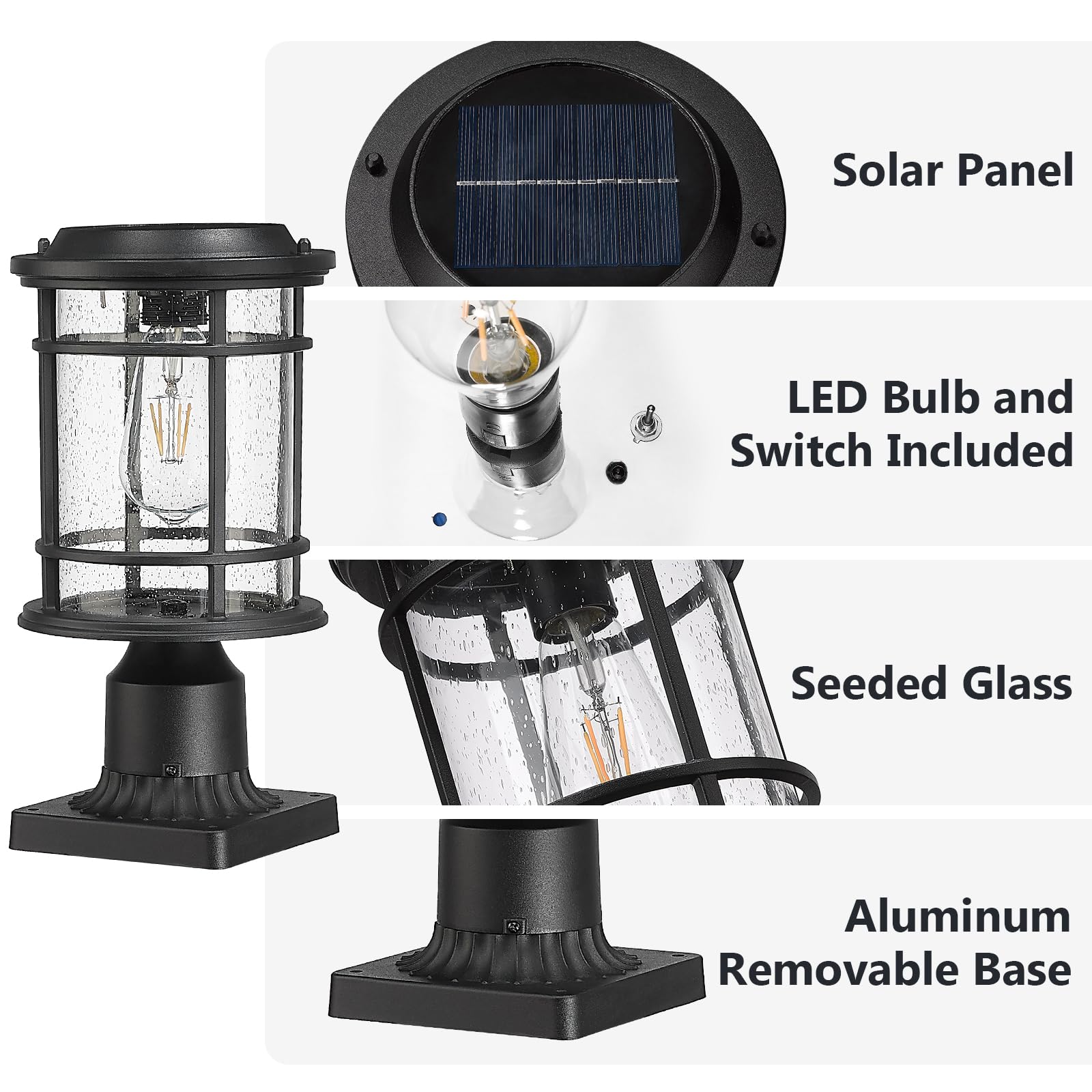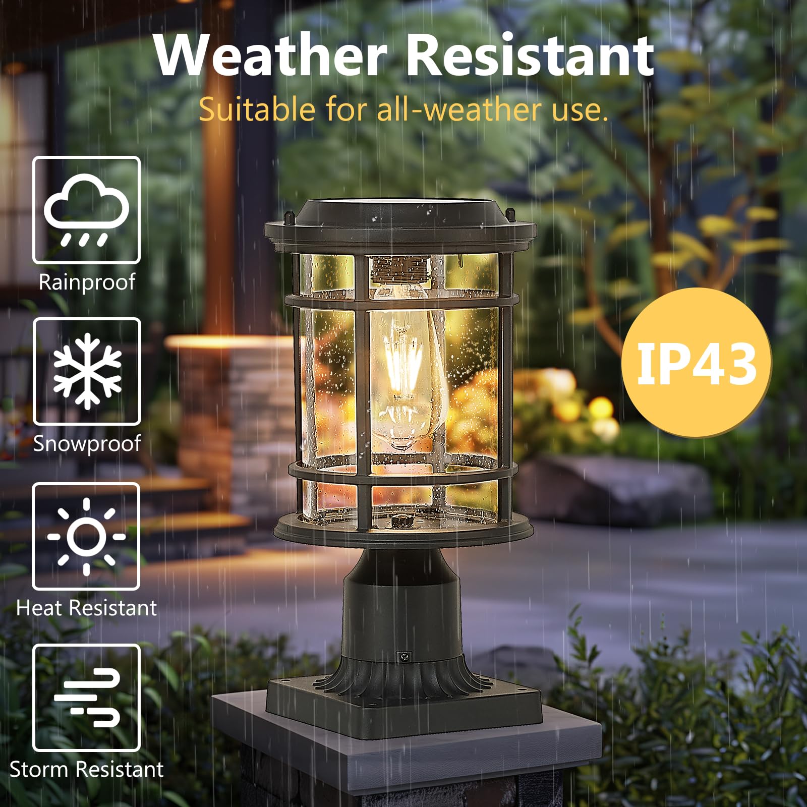 - Weather Resistant: With a waterproof rating of IP43, this solar pillar lantern is made of durable aluminum and seeded glass in a black finish, suitable for all-weather use. Comes with a pier mount adapter(removable) and a 2700K LED light bulb(Max 4W). ONLY Suitable for the ST64 LED bulbs - Asin: B0F2HWRPP9. Note:Not compatible with other LED bulbs.Ideal for gardens, courtyards, patios, pathways, or any other exterior place.