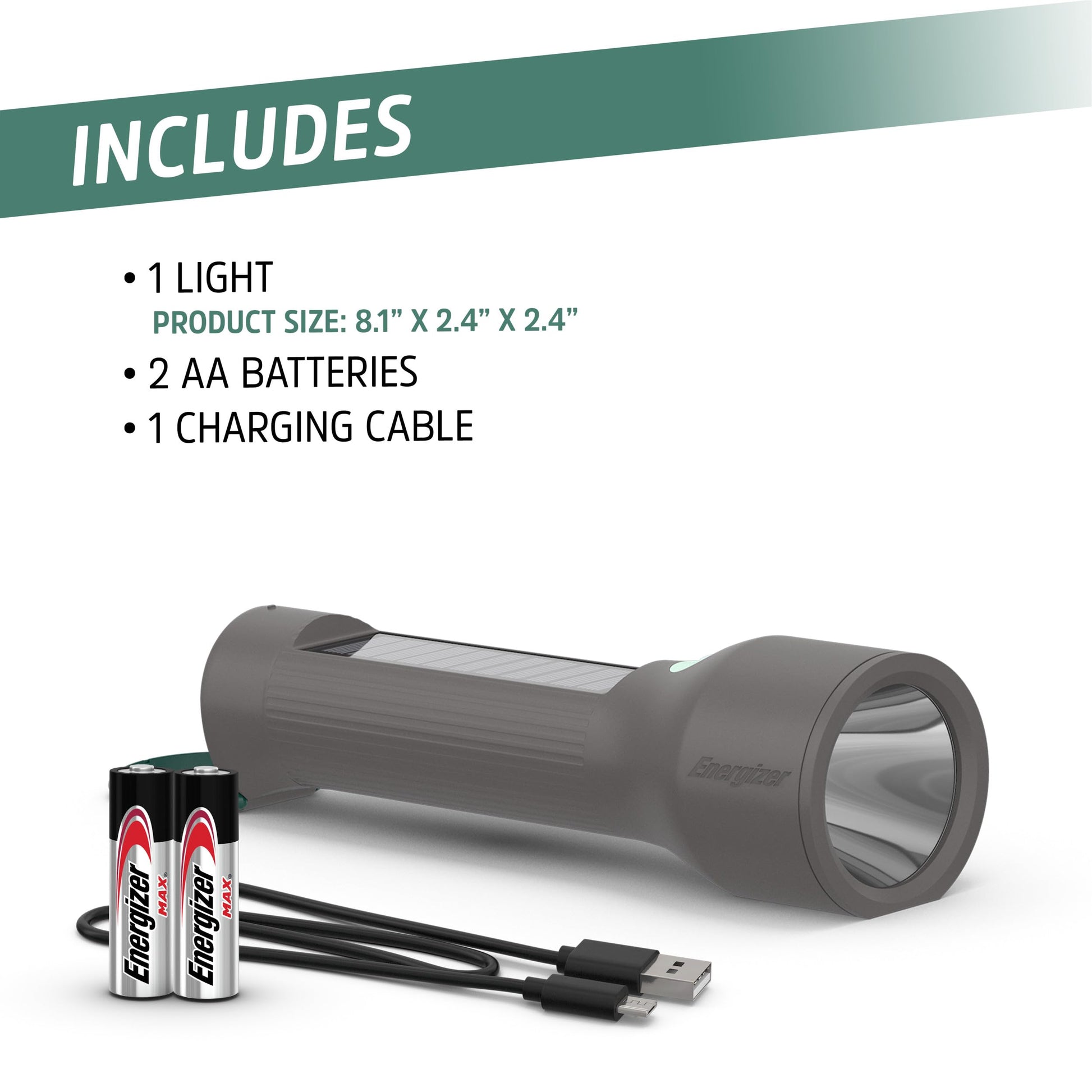 - HYBRID-POWERED LED FLASHLIGHT: One Energizer Hybrid Solar Flashlight, with the flexibility to run on 2 AA batteries or the rechargeable Lithium-Ion battery, which can be charged via solar panel or USB
