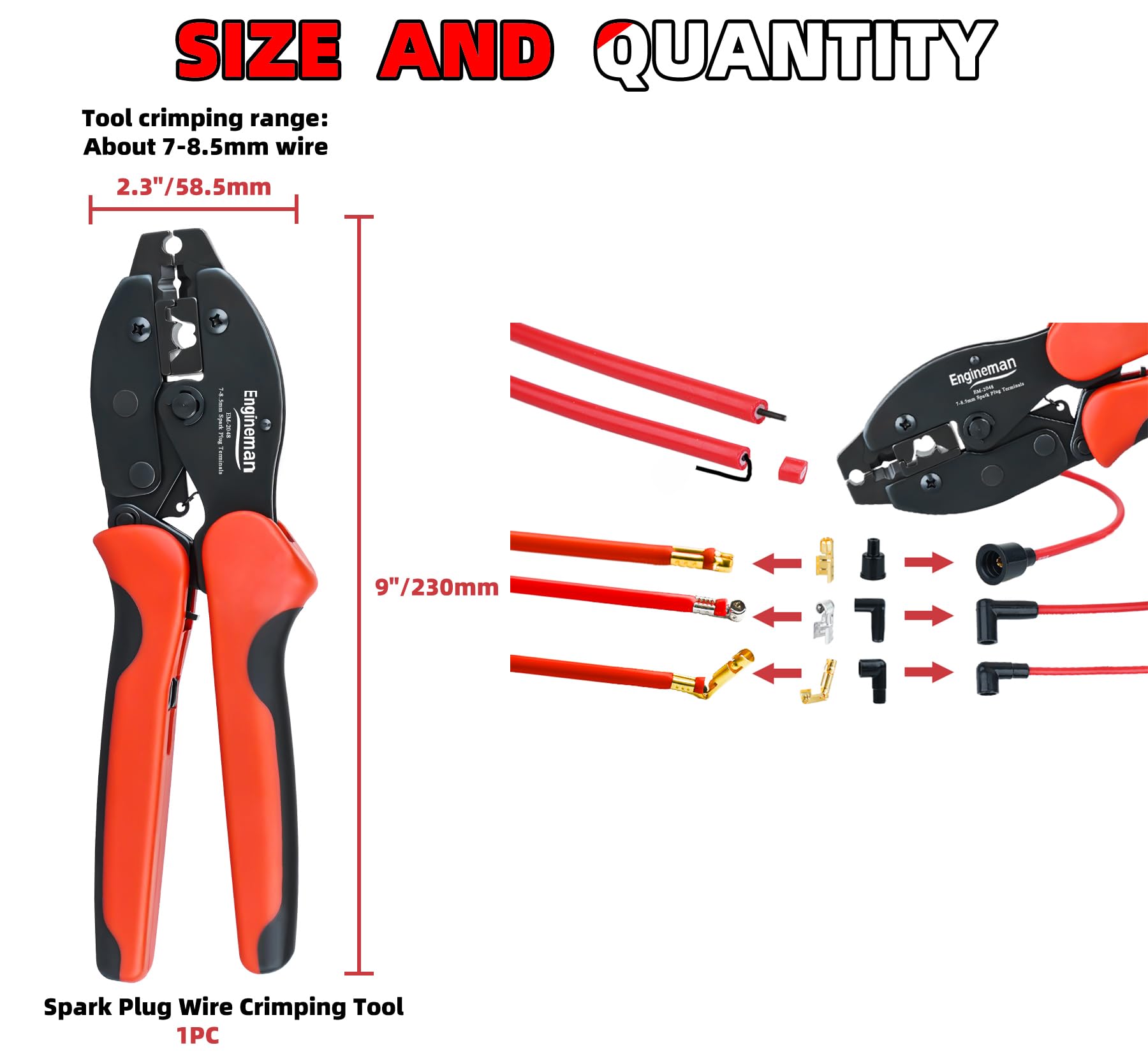 ENGINEMAN Spark Plug Wire Crimper, Crimping Pliers for Spark Plug Stripping Tool, EM-2048 for Crimping and Stripping Spark Plug Wire, Dia 7.0-8.5mm, Ratchet spark plug wire crimping tool